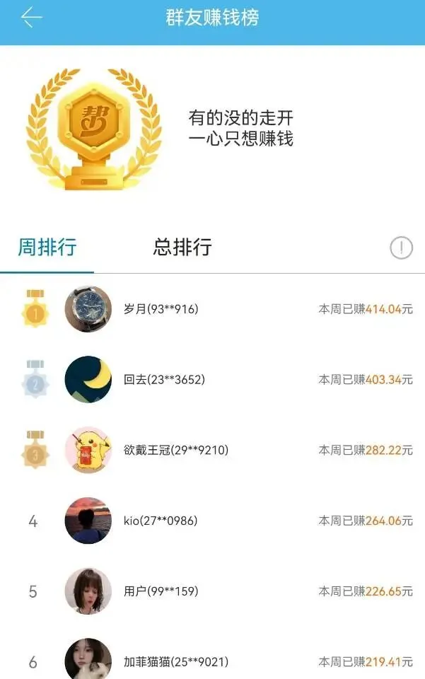 这是第3天的数据,还是上午时间,其中一个群里的友友赚的排行榜,当然这种赚的多的肯定是多劳多得哈,花费的时间和精力也比较多,付出与回报是成正比的!我呢只是每天利用点碎片时间,赚点小钱!