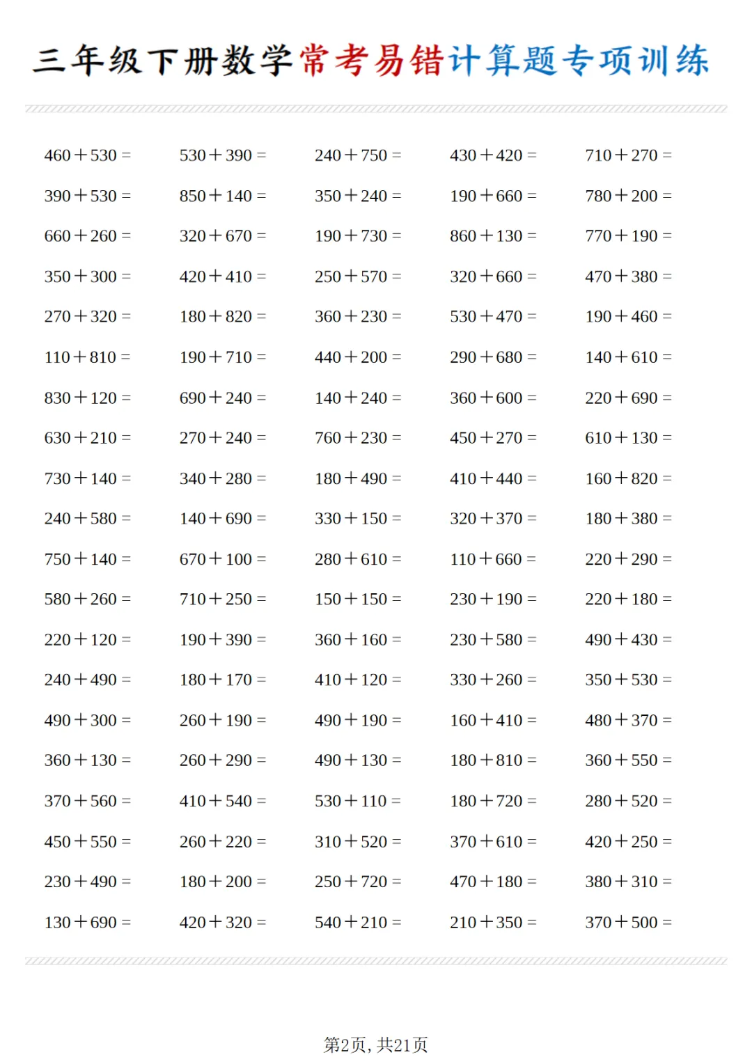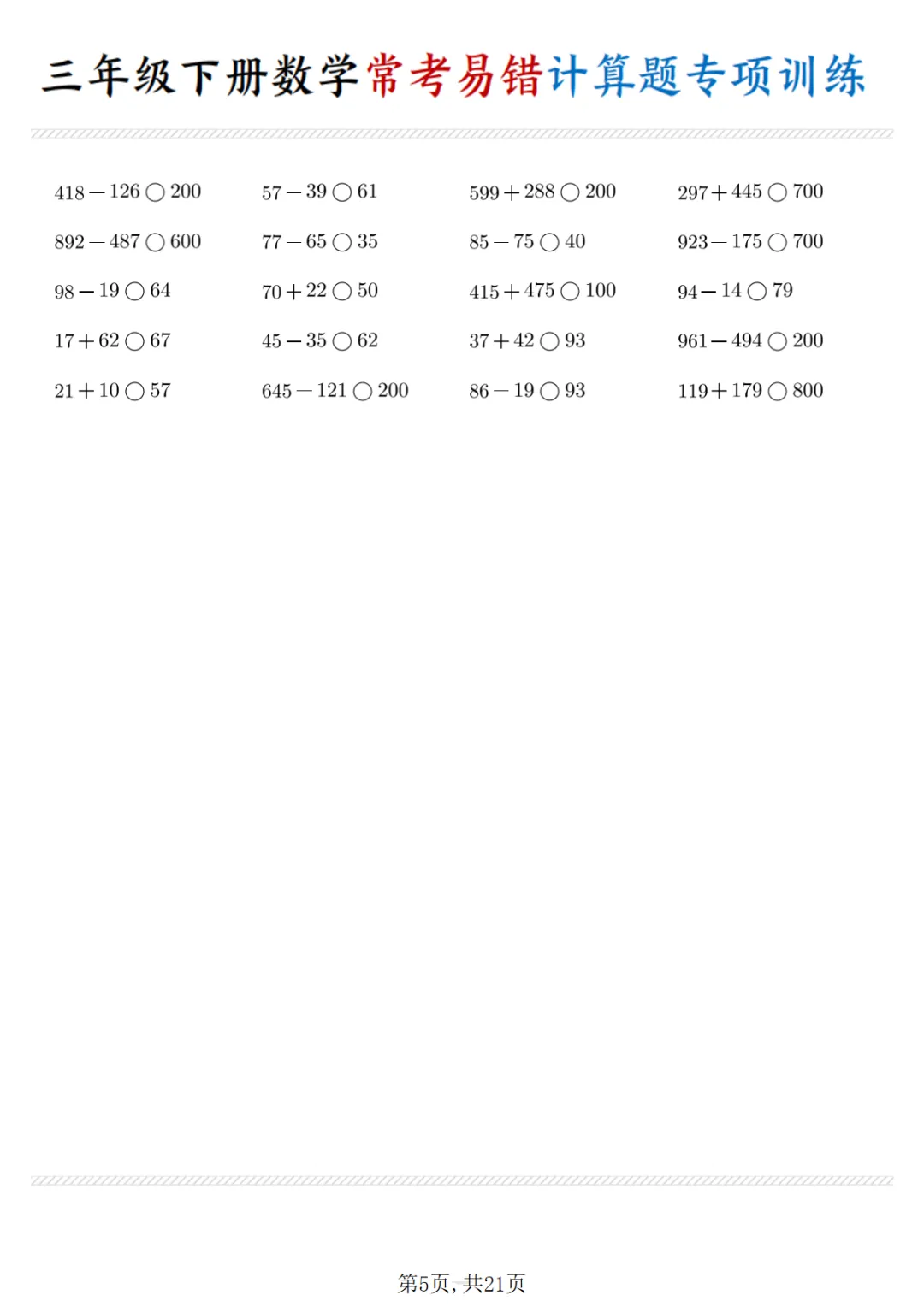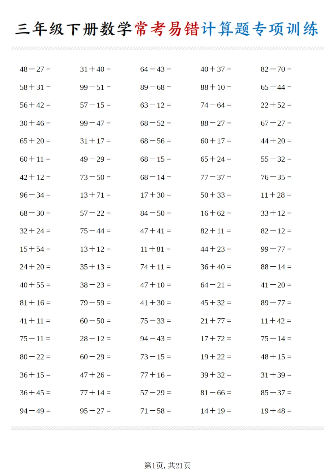 【免费下载】三年级(下)数学 常考易错计算题专项训练PDF高清电子版,可打印,先保存后下载