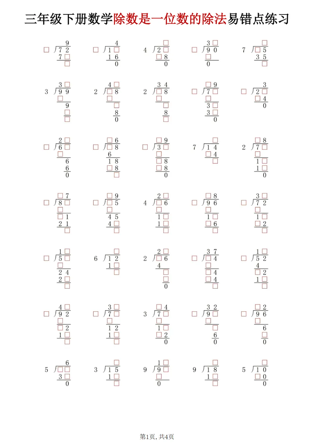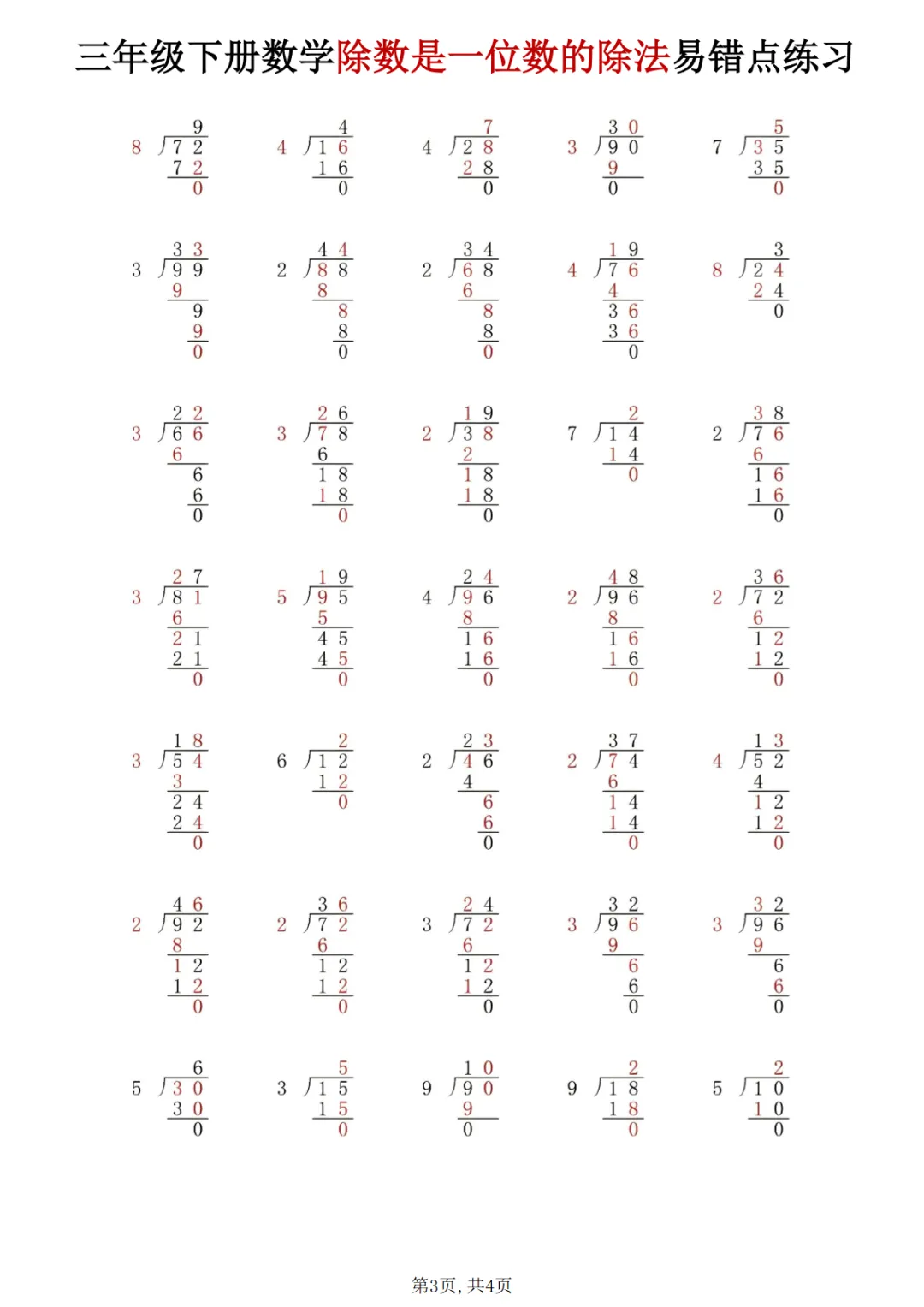 【免费下载】三年级(下)数学 除法是一位数的除法易错点练习PDF高清电子版,可打印,先保存后下载