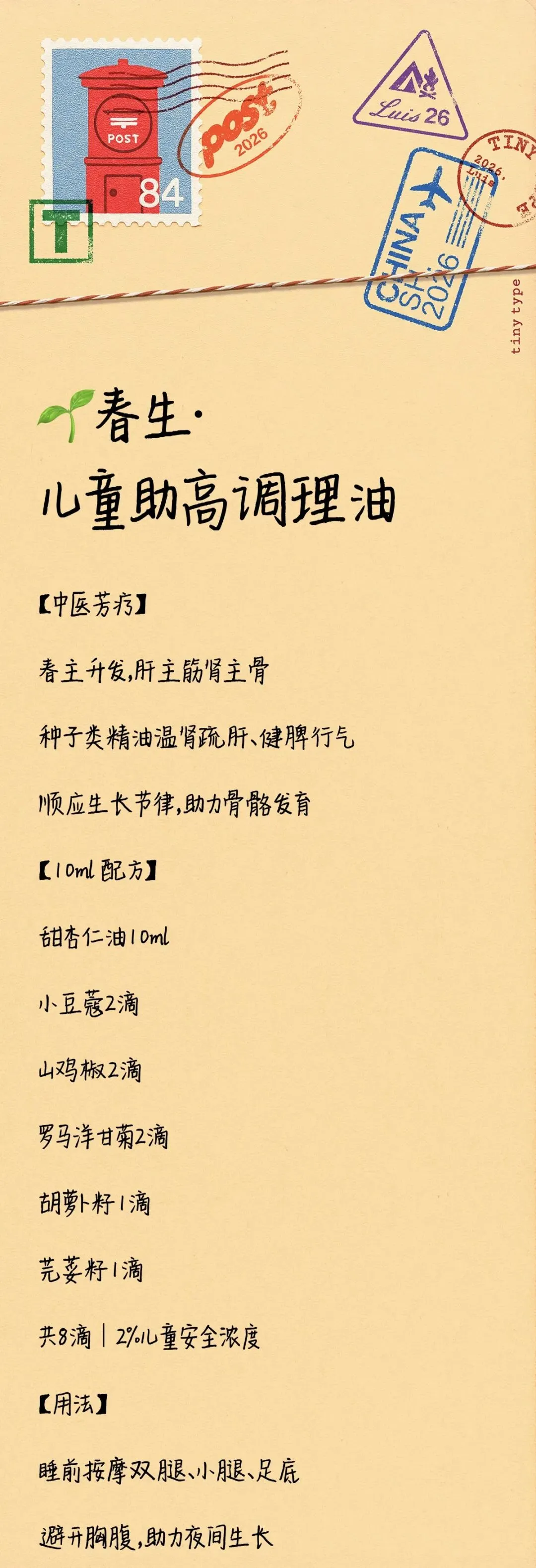 春主升发,肝主筋、肾主骨,种子类精油藏生发之力,温肾疏肝、健脾行气,顺应春日生长节律,助力孩子骨骼发育,气机升发不燥热。