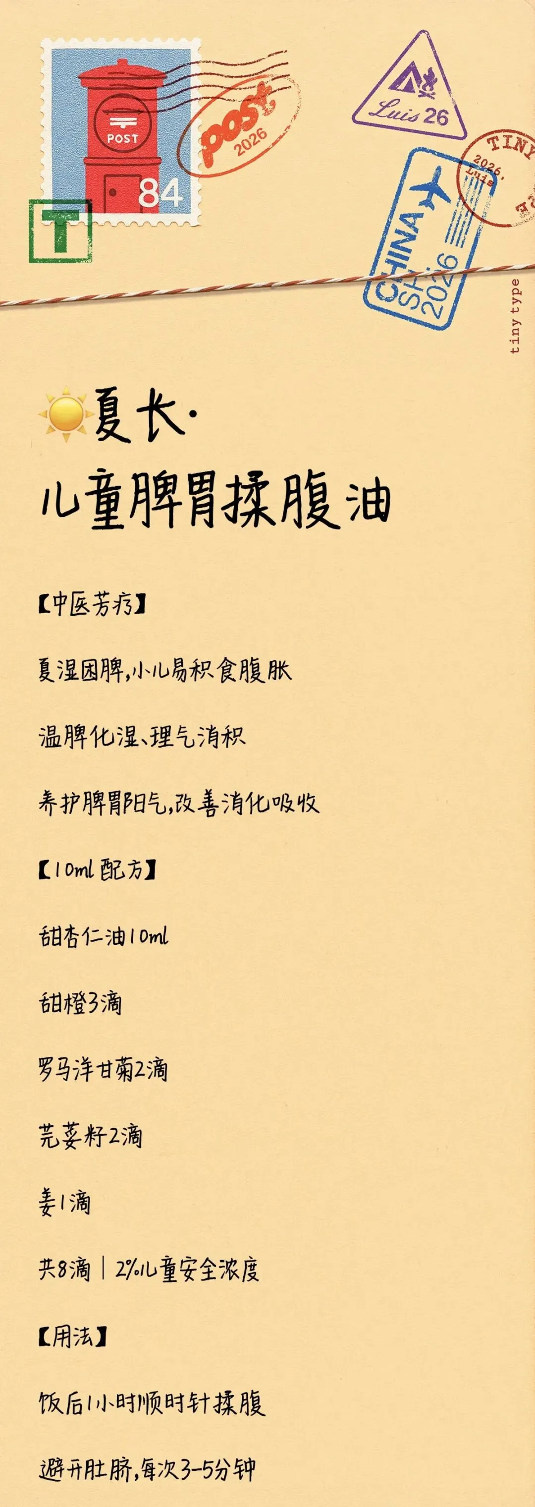 夏主长养,湿气易困脾,儿童脾胃娇嫩易积食、腹胀、挑食,此方温脾化湿、理气消积,温和养护脾胃阳气,改善消化吸收。