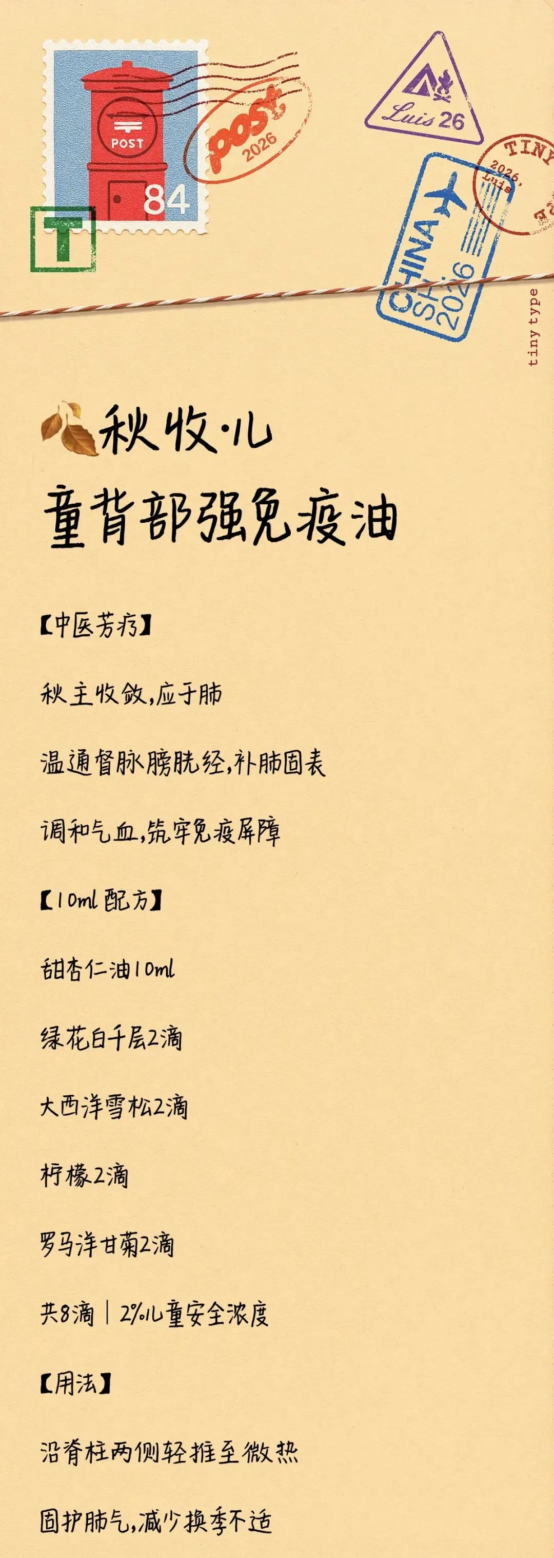 秋主收敛,应于肺,卫气不足则易换季不适,此方温通督脉与膀胱经,补肺固表、调和气血,筑牢孩子自身免疫力,减少外感侵扰。