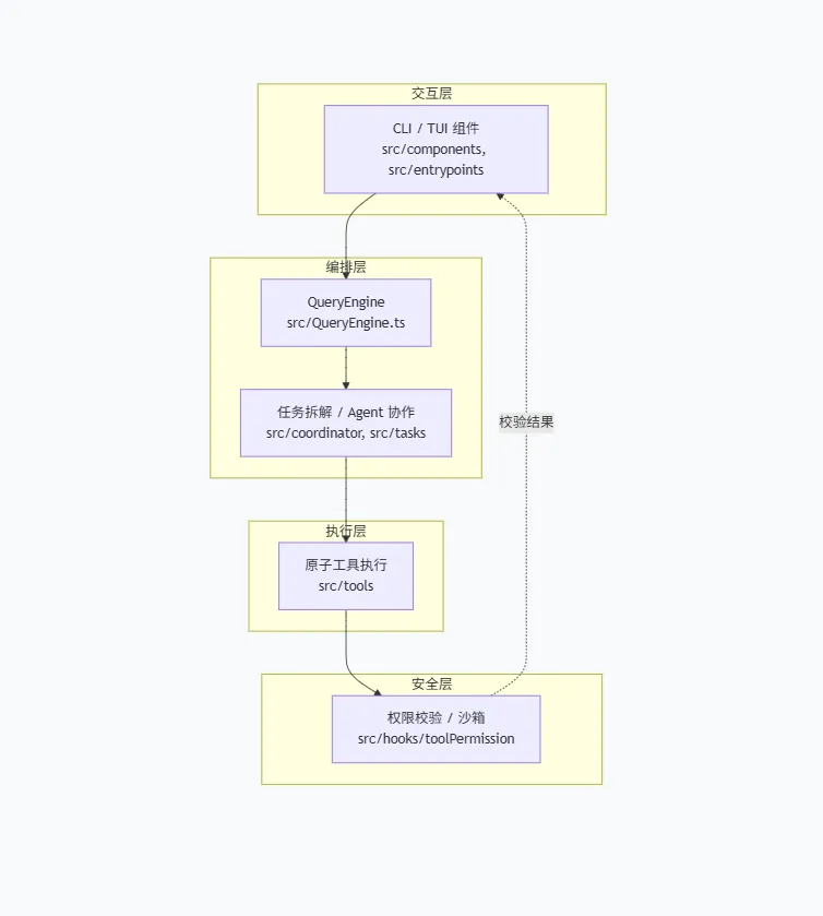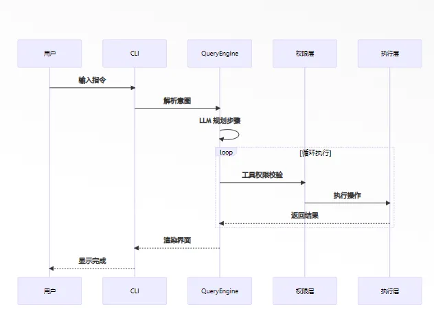 // src/QueryEngine.ts (简化示意)while (true) { const response = await client.messages.create({ context, history }); for (const block of response.content) { if (block.type === 'tool_use') { await validateToolPermission(block); // 安全前置 const result = await toolExecutor.execute(block); // 工具执行 history.push(createToolResult(block.id, result)); // 结果回灌 } } if (shouldStop(response)) break;}这也是它和“普通问答模型”最大的差别:它不是一次性回答,而是决策—执行—反馈的闭环系统。