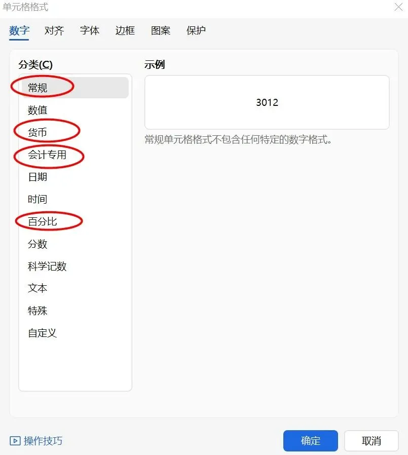 平常我们要调整数字格式,都是选中单元格,单击鼠标右键,选择【设置单元格格式】,在弹出的菜单里,选择需要调整的格式,如下图圈红所示,常规格式、货币格式、会计专用(即加¥)、百比分格式。