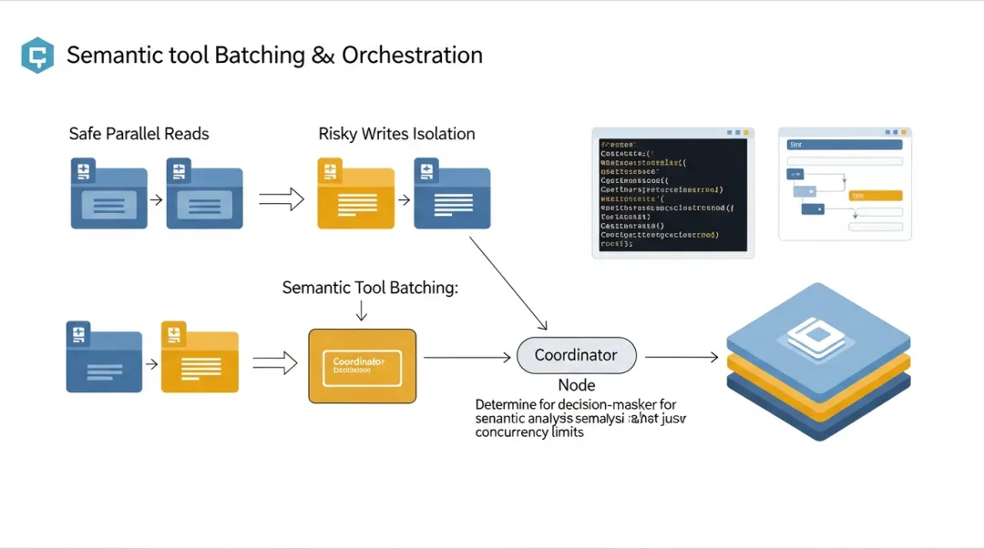 很多系统会在 prompt 里告诉模型“可以并行做读操作”。 Claude Code 更进一步,直接让工具实现自己声明并发安全性,然后由 orchestration 层执行。