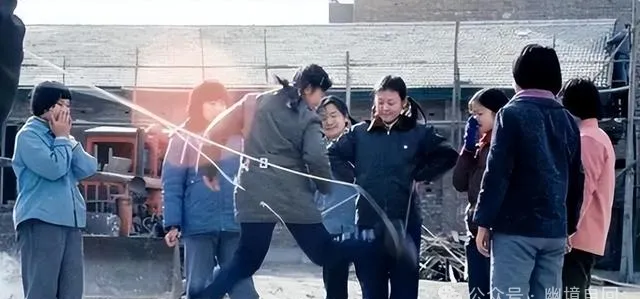 图里一根皮筋撑在两腿之间,几个人围成圈,这就是跳皮筋,小时候谁家巷子里不得有一群小姑娘朝天蒙蒙亮就开始比谁蹦得利索,嘴里还要念小调“马兰开花二十一”,天黑了都不乐意回家,裤腿蹭出俩大泥点,回头还得挨一句训,到了现在路边早就看不到这场面了,听见皮筋声脑子里全是娃娃哪家的笑。