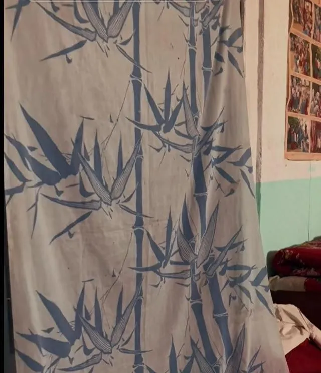 图中的老布帘,家里来了客或者分点小空间,就靠这块棉布支溜着一拉一挂,随便一块布画着竹子、鸟,卧室门口一挡就稳稳当当地私密,小孩躲里面闹腾,外头大人能多聊会天,那会儿没有什么玻璃门拉帘,就靠这布帘开关之间划出界限,老家还真留着几块当年的布花,现在见了心里头还是温吞。