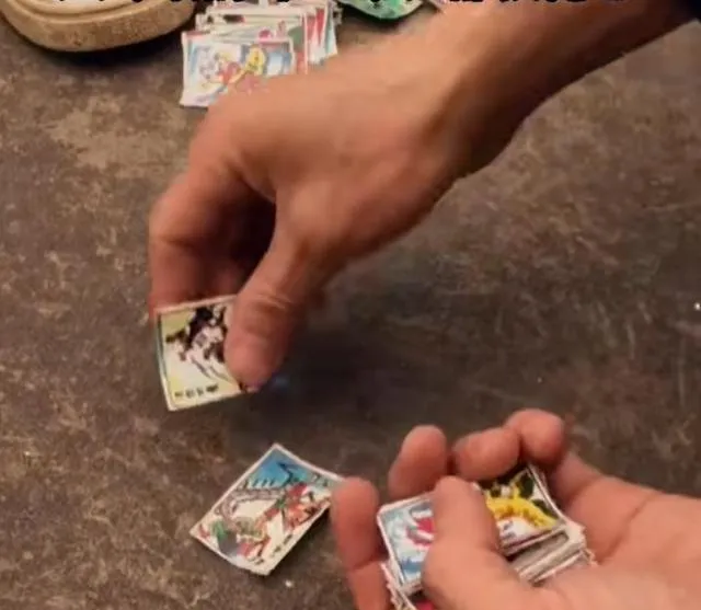 一堆小“洋画”,也叫拍画贴纸,当年全班都爱,一沓沓小方块积攒着换来换去,哪张是孙悟空,哪张是黑猫警长,谁要收齐一套全班都服气,课间组局“啪”一声拍过去,带着泥巴和汗贴在袖子口袋里,长大后再见只能当作儿时的战利品,家里翻出来全是回忆。