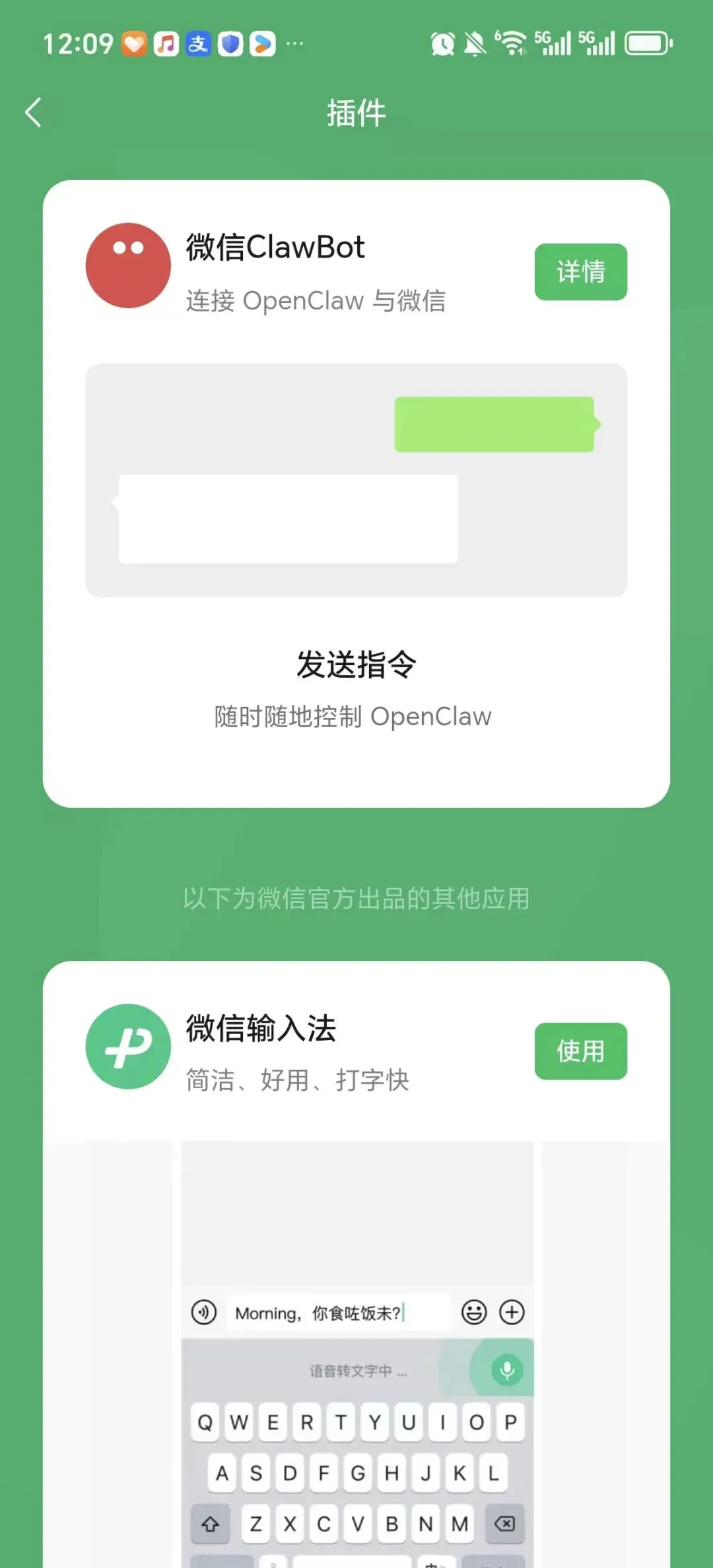 路径很好记:我 → 设置 → 插件。如果你点进去没看到ClawBot,别急,重启一下微信。我试了两次,第二次就刷出来了。有人说这是灰度刷新机制,总之“重启大法”在这里管用。