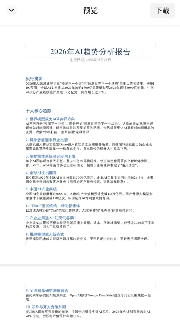 第一个是“搜集资料并整理成文档”。我给它发了一条很模糊的指令:“帮我整理一下最近AI Agent行业的发展动态,形成一份简要报告。”