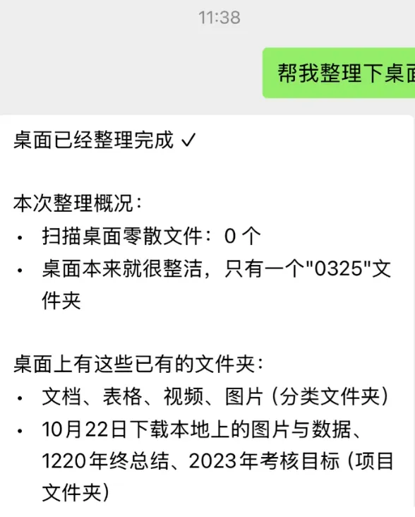 第二个场景我让它“整理桌面”。这个指令听起来有点抽象,其实它做的是远程控机——在我OpenClaw所在的那台设备上,执行了文件整理操作,把桌面杂乱的截图和文档分门别类归档,然后返回了一份操作日志。虽然我桌面本身不算乱,但它描述得清清楚楚:移动了几个文件、新建了哪些文件夹、释放了多少空间。