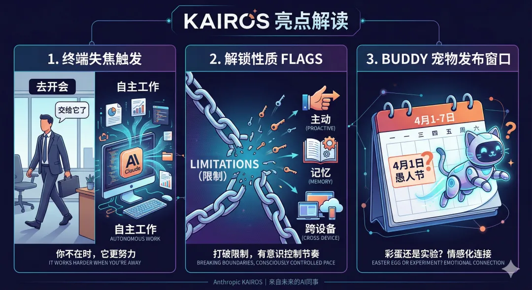 当前的 Claude Code 是被动的——你问,它答。KAIROS 模式下,Claude 变成主动的”常驻同事”: