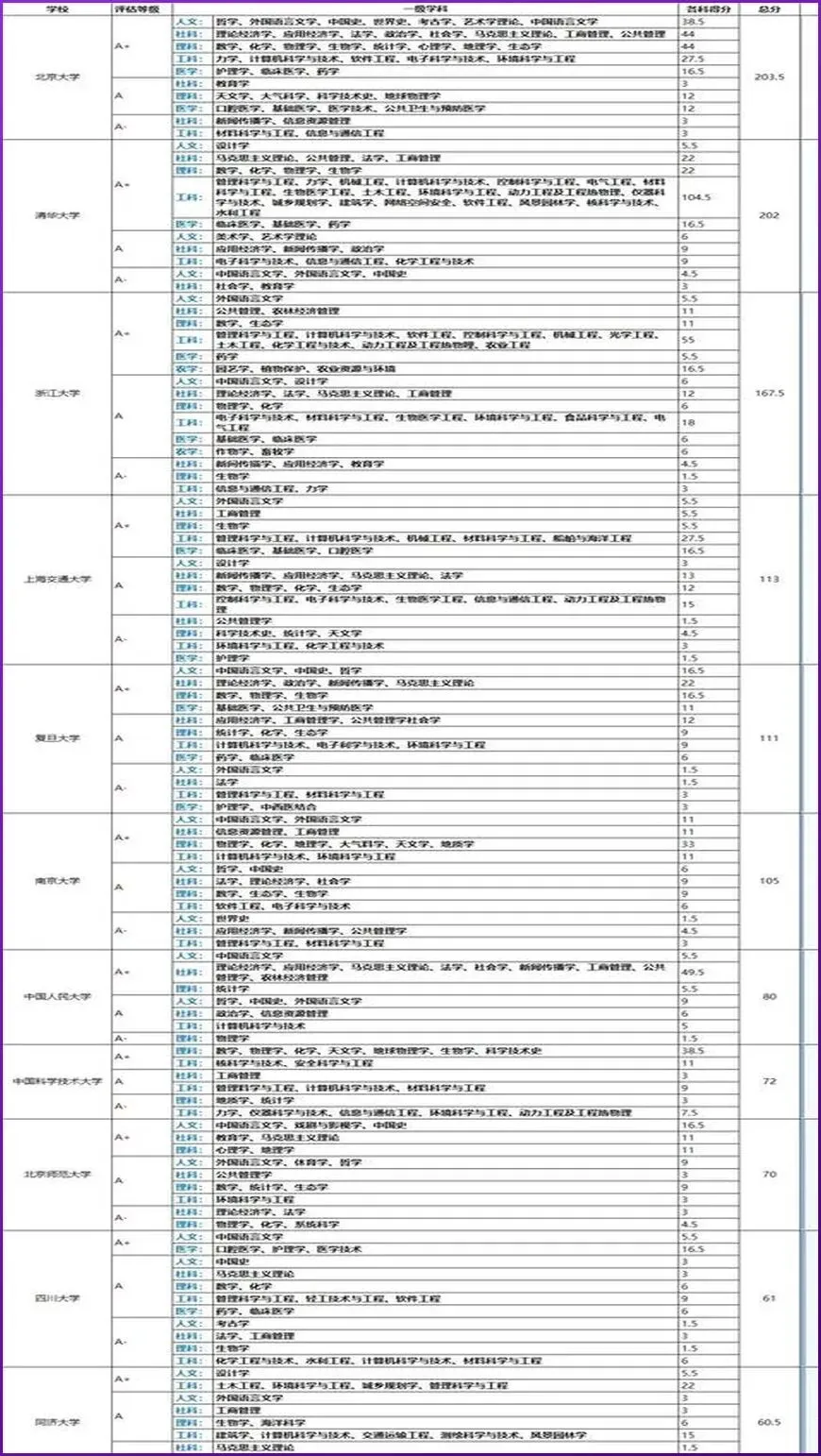 清华大学在第四轮评估中共有35个A类学科,北京大学同样有35个A类学科,其中北大有21个学科获得A+,位居全国高校第一,浙江大学的A类学科数量同样超过30个,在工科领域的覆盖面尤为突出。