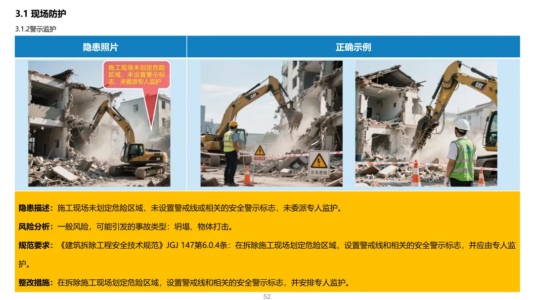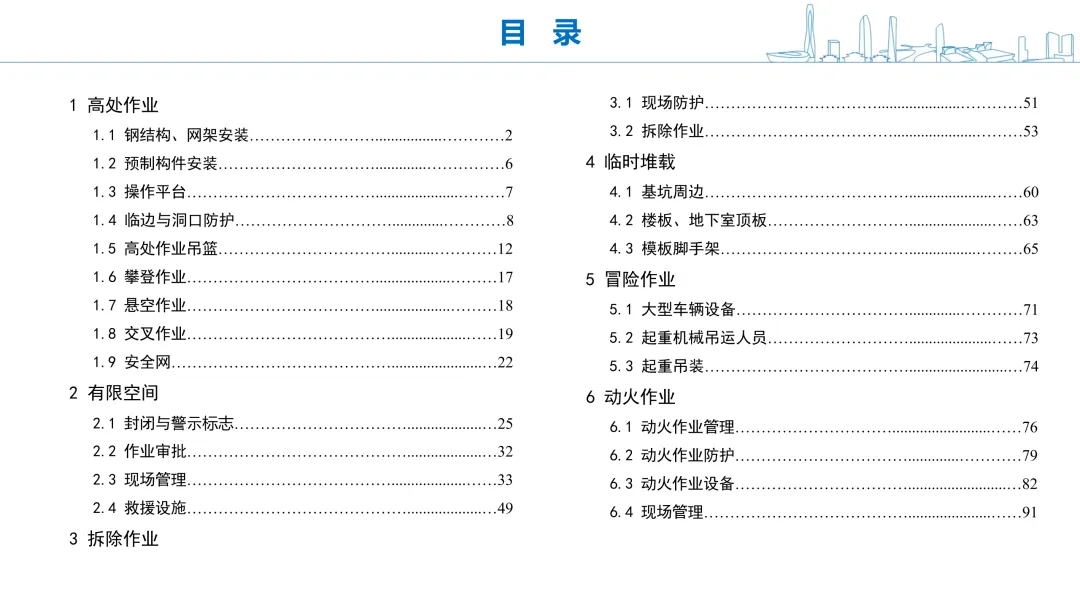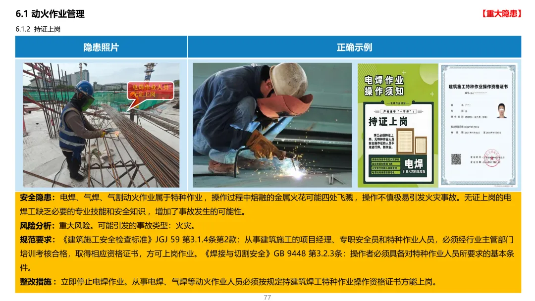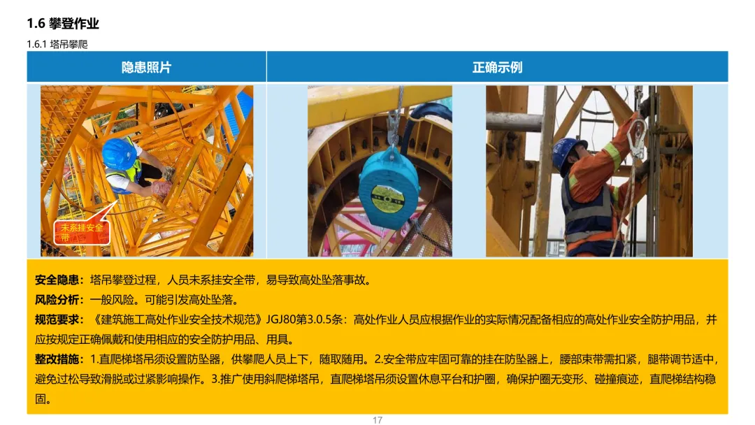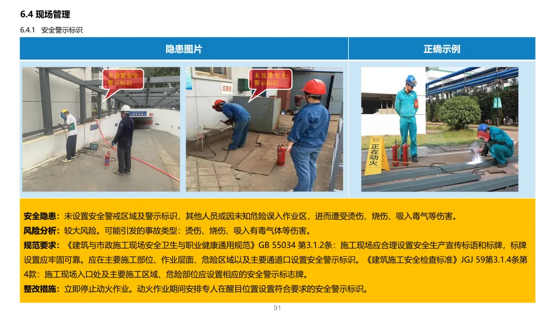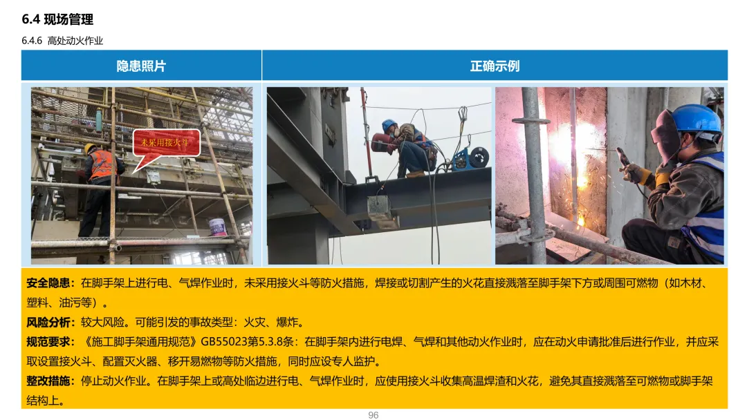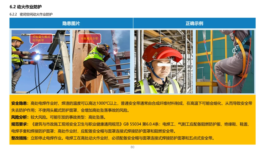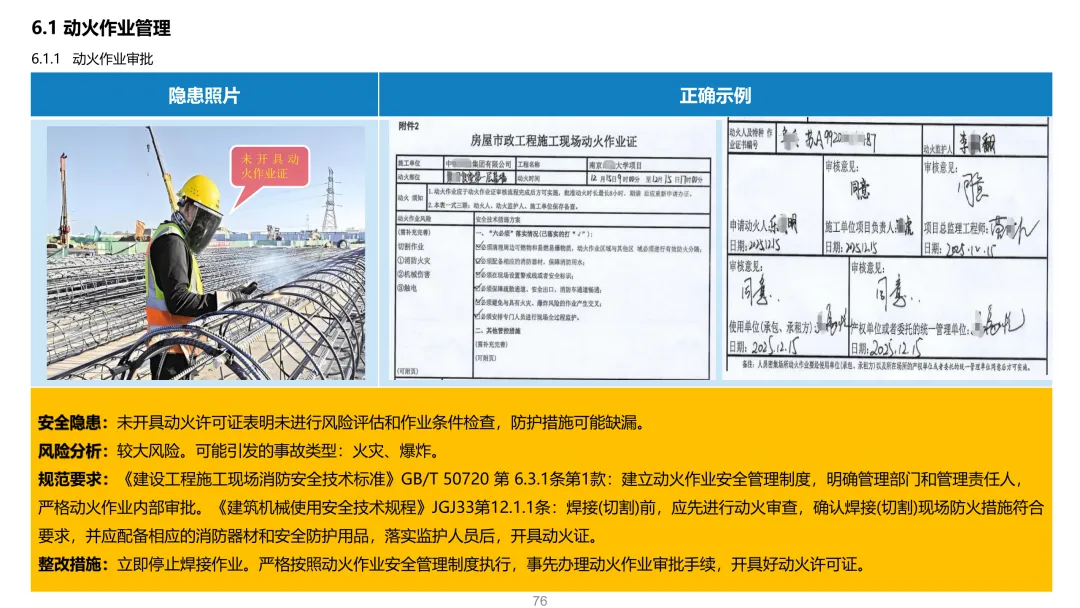 江苏省住建厅编制的“高处作业、有限空间、动火作业等6大高风险作业事故隐患辨识图集”系统梳理了高处作业、有限空间、拆除作业、临时堆载、冒险作业、动火作业六个关键环节中常见且易被忽视的安全隐患。通过高清实景图片、典型隐患示意图与规范条文对照,直观呈现隐患形态,明确违反的规范条款,剖析潜在风险与可能后果,并提供相应的正确做法示例。