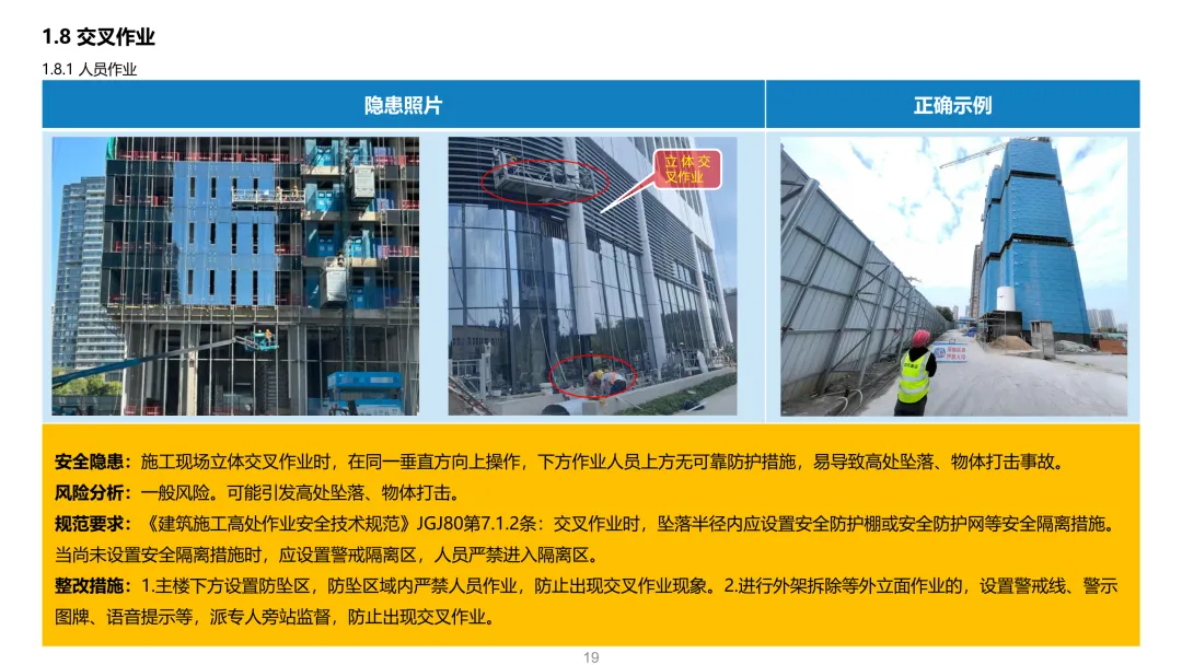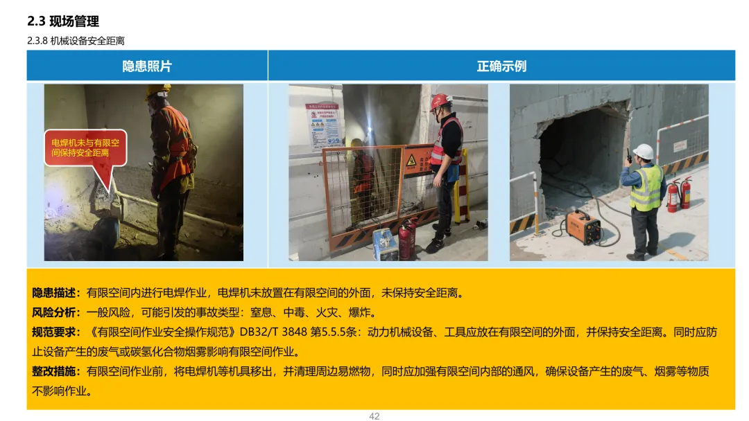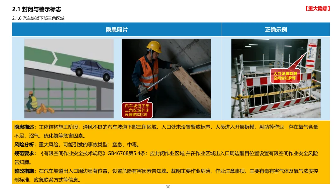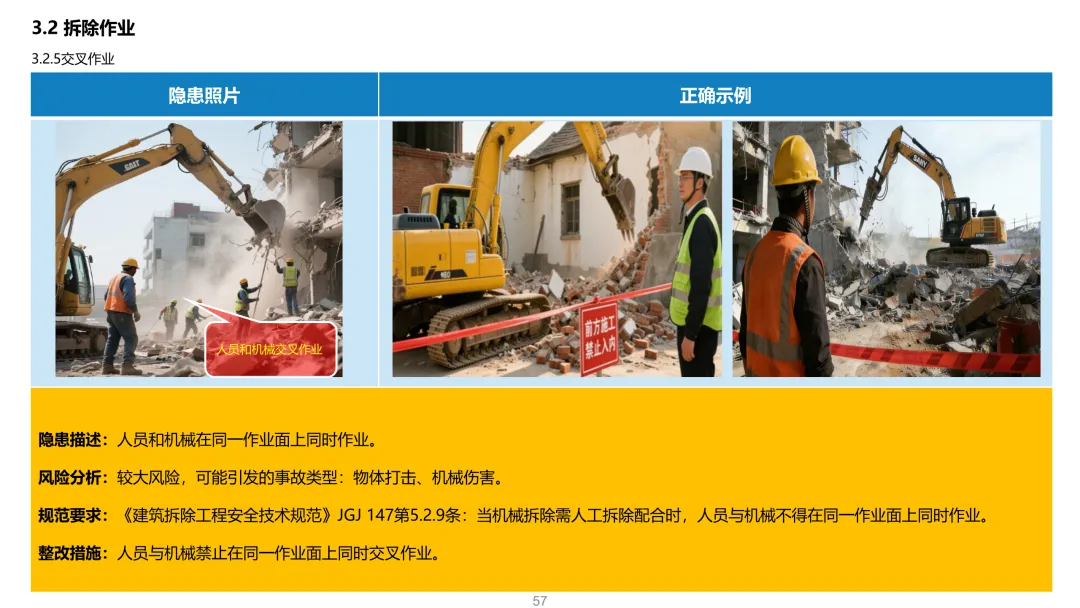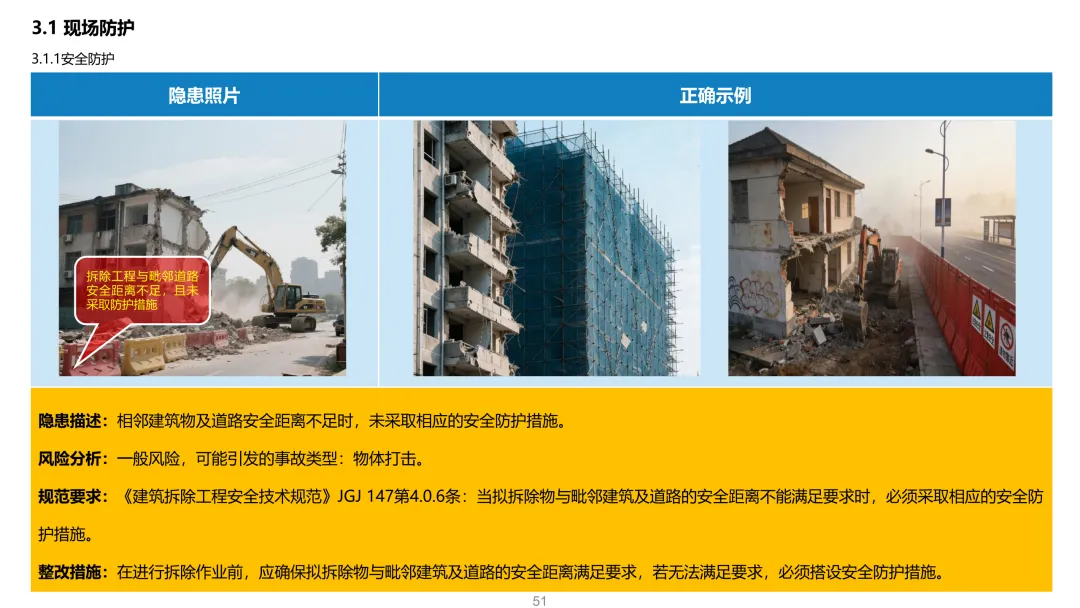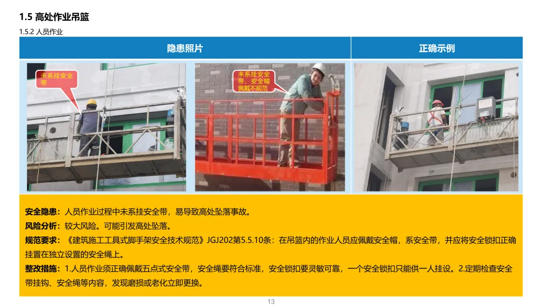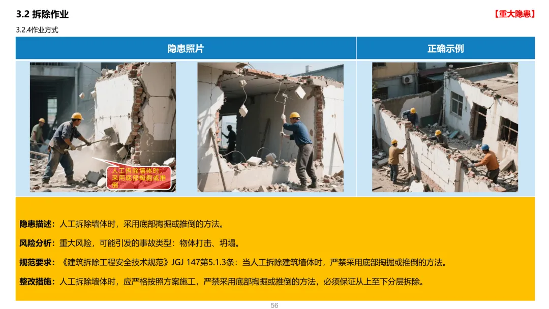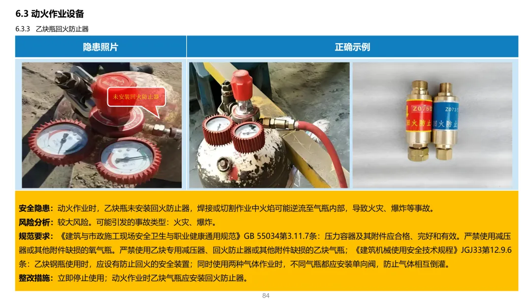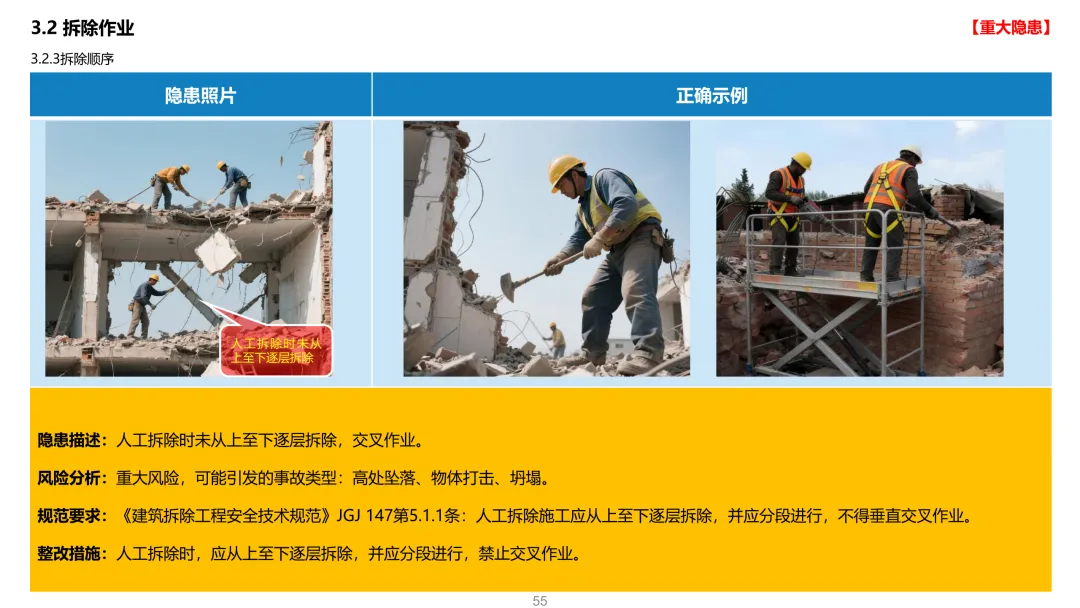 江苏省住建厅编制的“高处作业、有限空间、动火作业等6大高风险作业事故隐患辨识图集”系统梳理了高处作业、有限空间、拆除作业、临时堆载、冒险作业、动火作业六个关键环节中常见且易被忽视的安全隐患。通过高清实景图片、典型隐患示意图与规范条文对照,直观呈现隐患形态,明确违反的规范条款,剖析潜在风险与可能后果,并提供相应的正确做法示例。