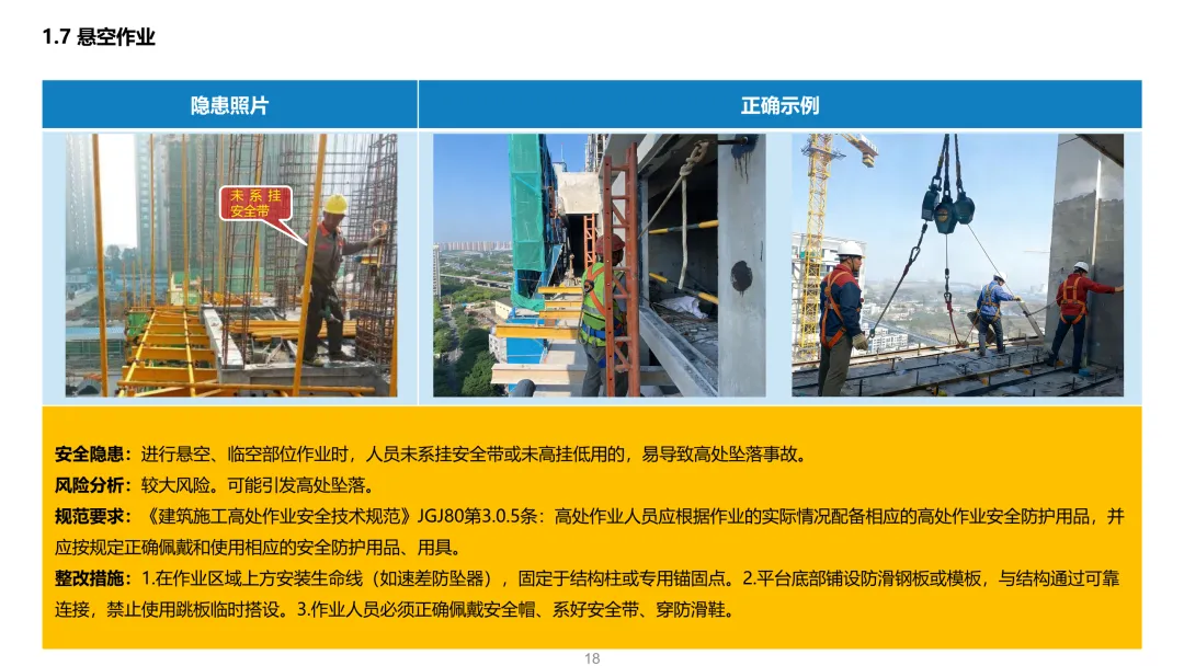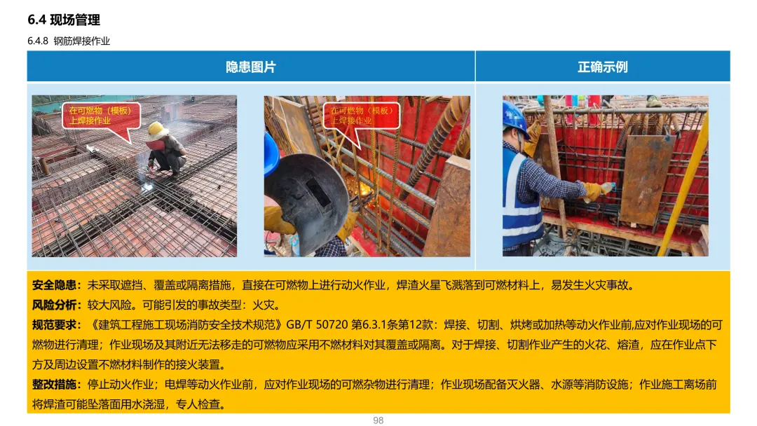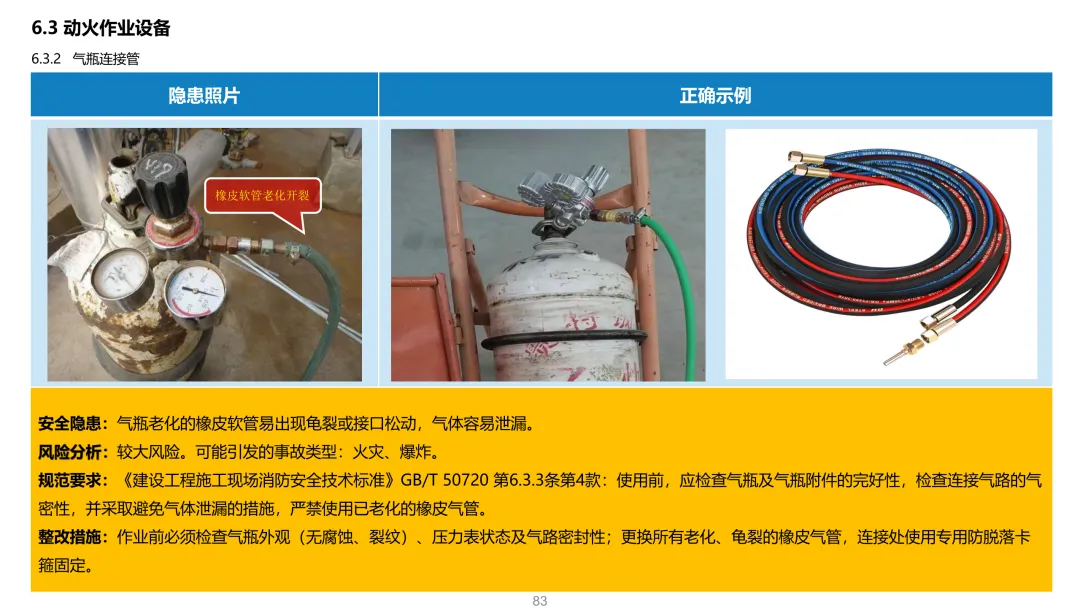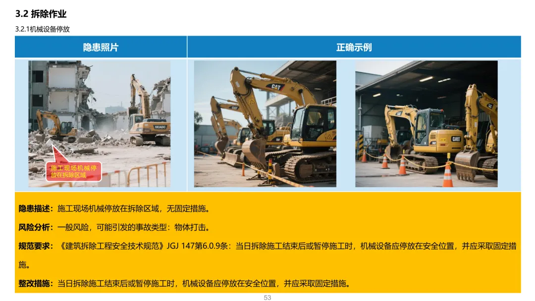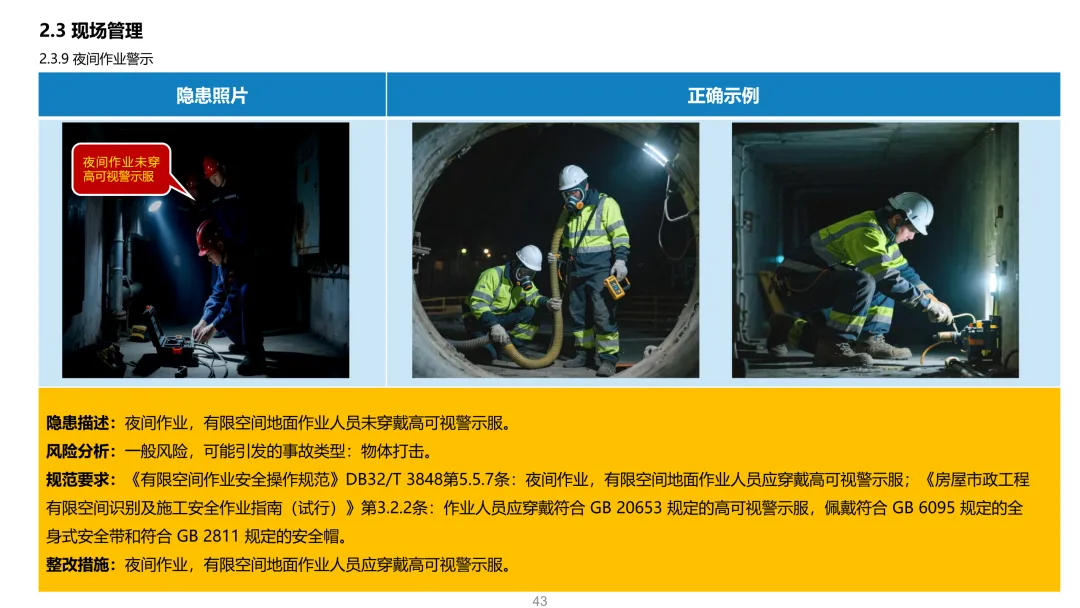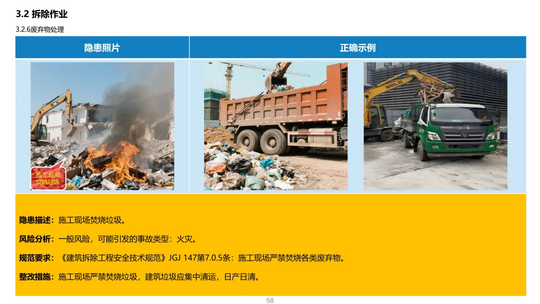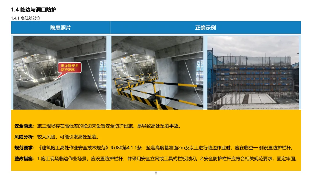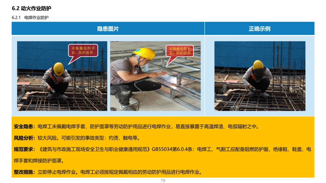 江苏省住建厅编制的“高处作业、有限空间、动火作业等6大高风险作业事故隐患辨识图集”系统梳理了高处作业、有限空间、拆除作业、临时堆载、冒险作业、动火作业六个关键环节中常见且易被忽视的安全隐患。通过高清实景图片、典型隐患示意图与规范条文对照,直观呈现隐患形态,明确违反的规范条款,剖析潜在风险与可能后果,并提供相应的正确做法示例。