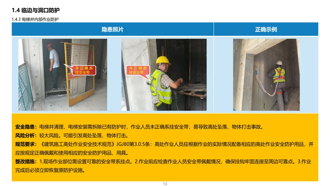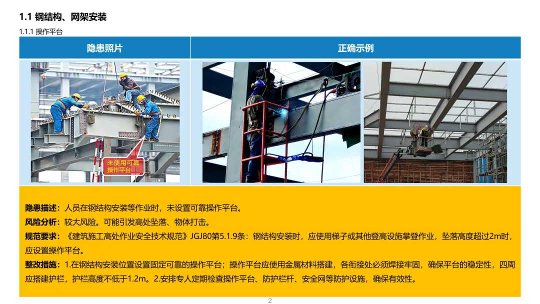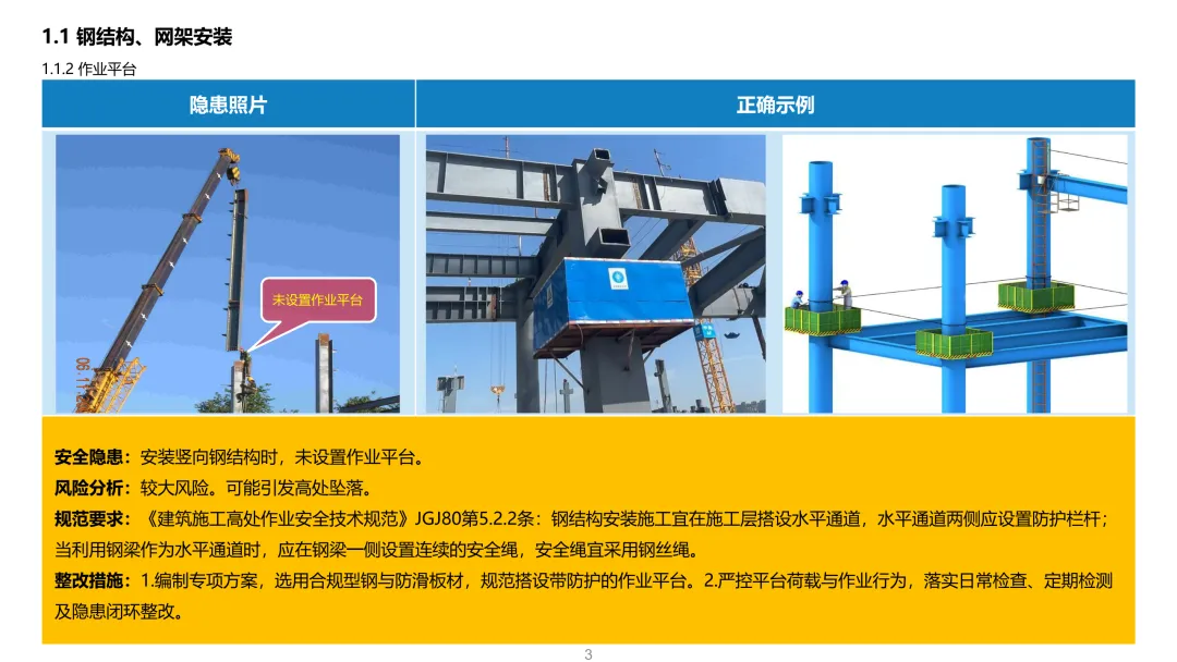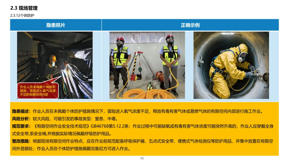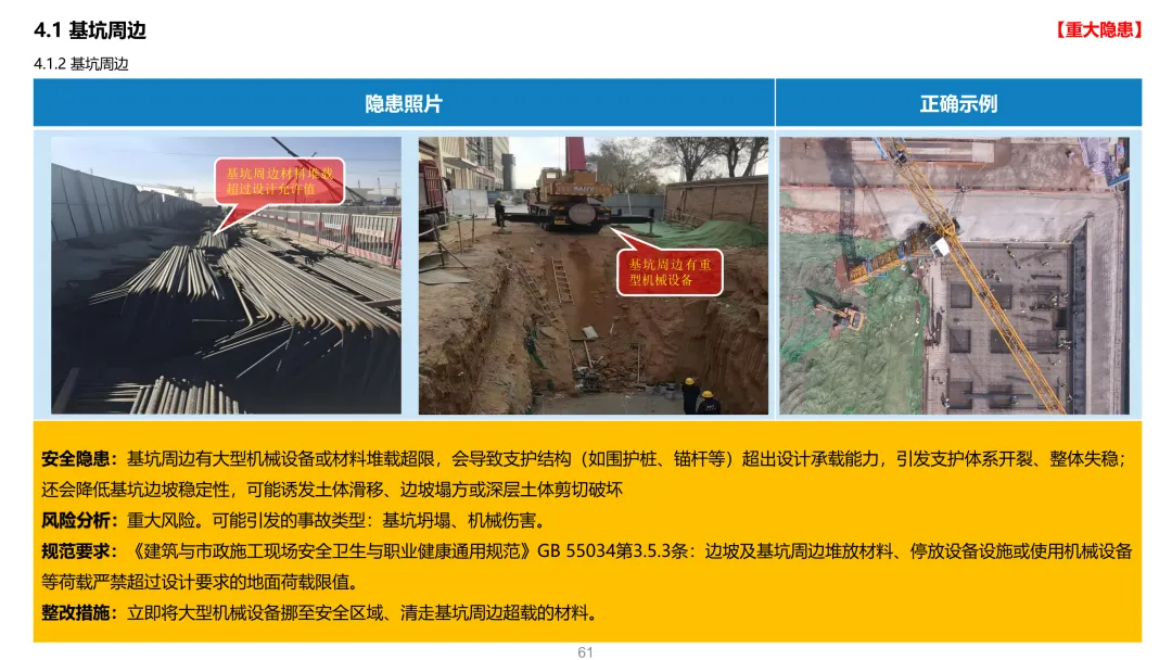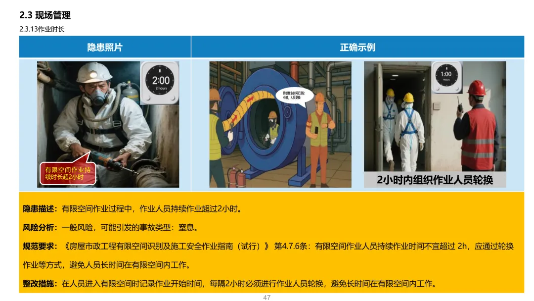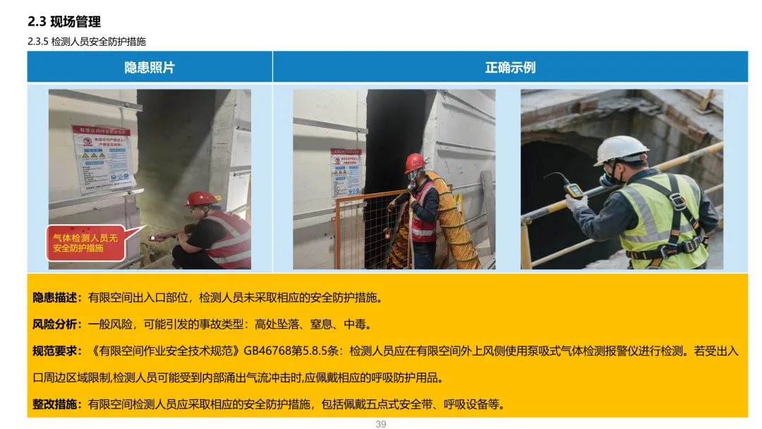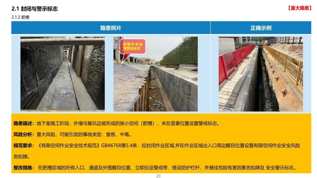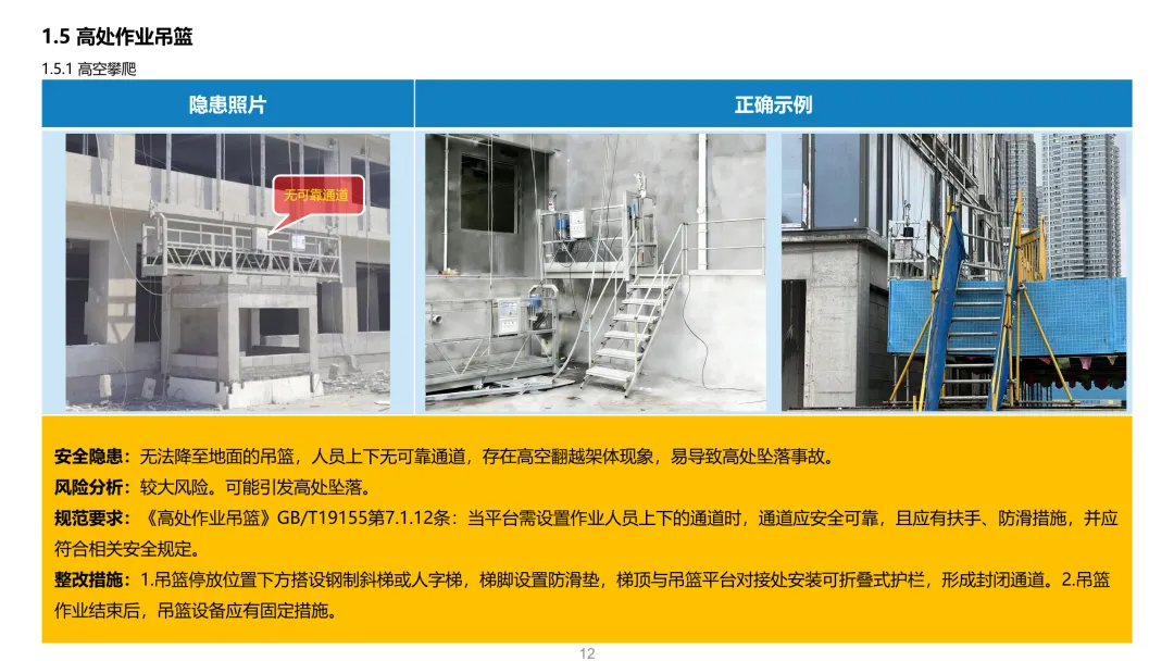 江苏省住建厅编制的“高处作业、有限空间、动火作业等6大高风险作业事故隐患辨识图集”系统梳理了高处作业、有限空间、拆除作业、临时堆载、冒险作业、动火作业六个关键环节中常见且易被忽视的安全隐患。通过高清实景图片、典型隐患示意图与规范条文对照,直观呈现隐患形态,明确违反的规范条款,剖析潜在风险与可能后果,并提供相应的正确做法示例。