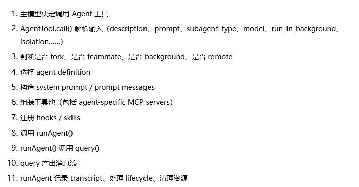 而 runAgent() 则是一个完整的 子 agent runtime constructor:初始化 agent-specific MCP、过滤 context messages、处理 read-only agent 的 claudeMd slimming、构造 permission mode、执行 SubagentStart hooks、预加载 frontmatter skills、合并 agent MCP tools、最后调用 query() 进入主循环。