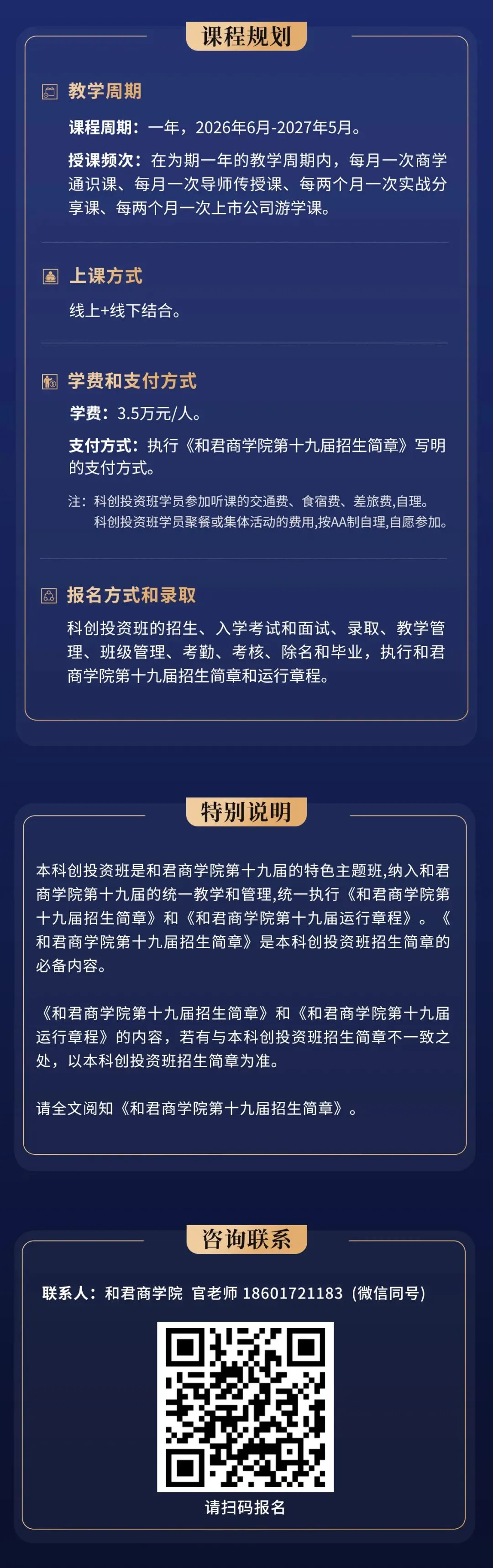 和君商学是和君集团属下的北京和君商学在线科技股份有限公司兴办的一个商学培训计划,学制为一年一届,主要面向拥有名校学历的职场人才和在校高年级学生招生,旨在培养企业经营和管理、金融、投资、创业创新等领域的职业高手,帮助学员实现高薪就业、转行、换岗、晋升、高阶职业发展、创业、事业升级。办学历史23年(2003-2026),累计培训了两万多名拥有名校本硕博学历的青年人才和企业家人才。