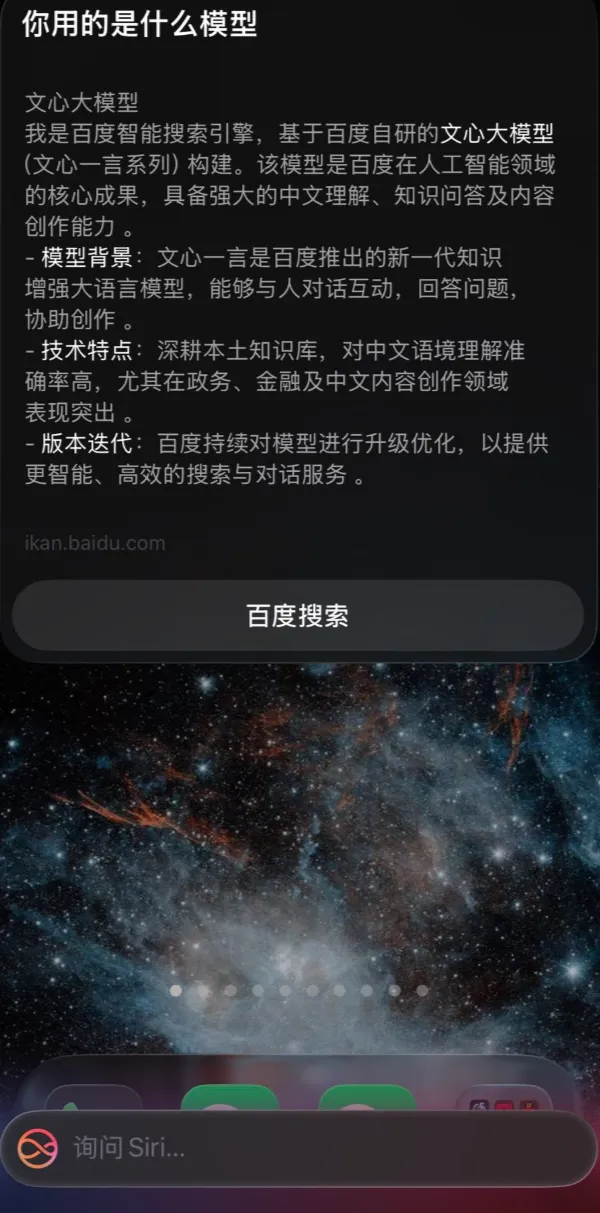 Siri对话:长按电源键可与增强版Siri进行实时、联网对话。国行版本是与百度的“文心一言”合作,搜索结果来自百度,用工具之后支持GPT。