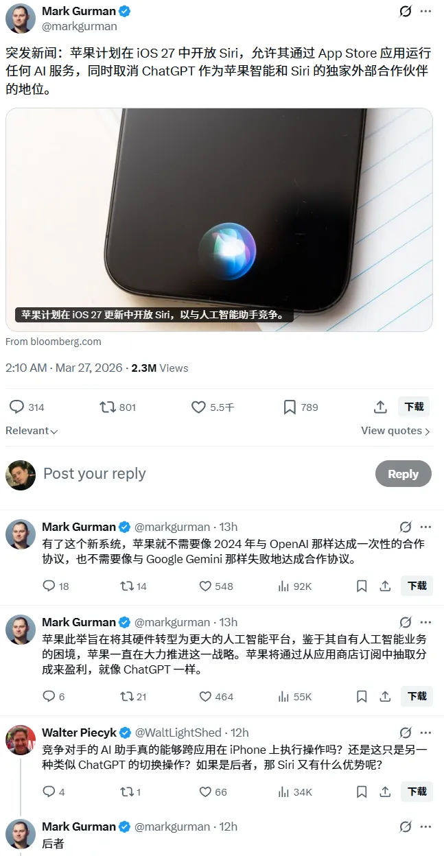 苹果想在 iOS 27 中开放Siri。