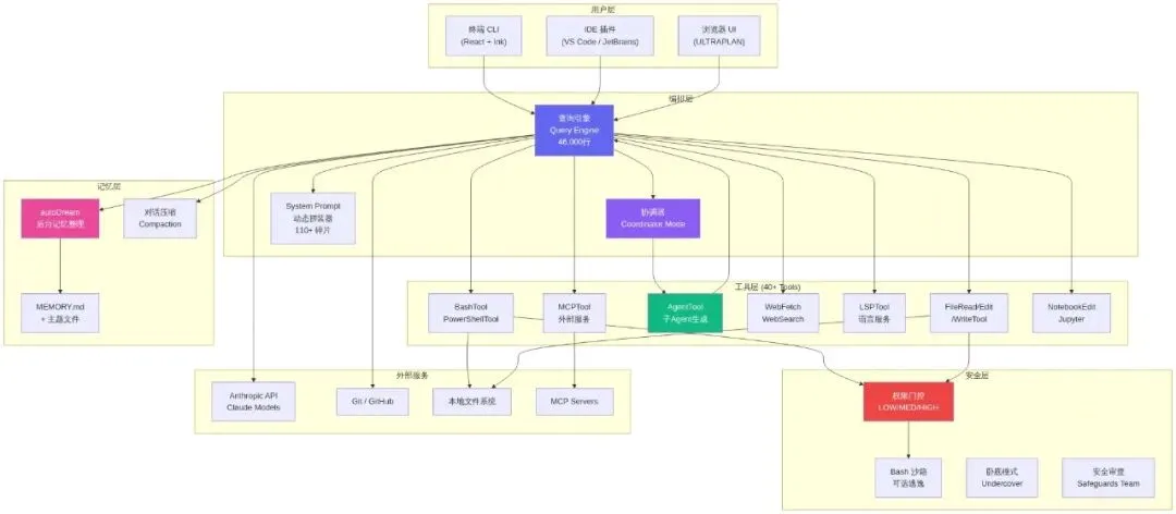 编排层:核心是查询引擎(Query Engine),46,000行代码,整个系统最大的单一模块。负责所有LLM API调用、流式响应、缓存和上下文编排。旁边还有一个协调器(Coordinator Mode),开了之后能变成多Agent调度中心。