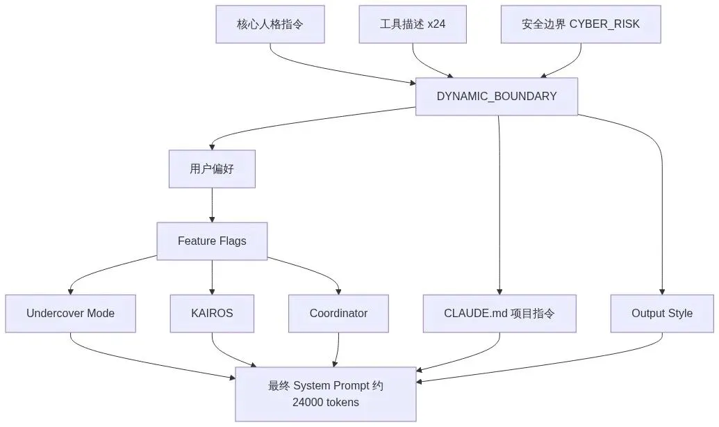 它的system prompt由110多个碎片根据运行条件动态拼装而成。中间有一个叫SYSTEM_PROMPT_DYNAMIC_BOUNDARY的标记,把prompt分成两段: