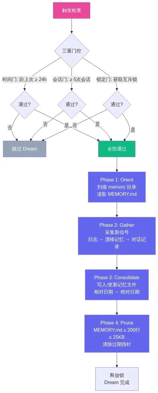 源码里有一个叫autoDream的模块,是一个后台记忆整理引擎。Anthropic的工程师很浪漫,给它起名叫”Dream”——AI在做梦。