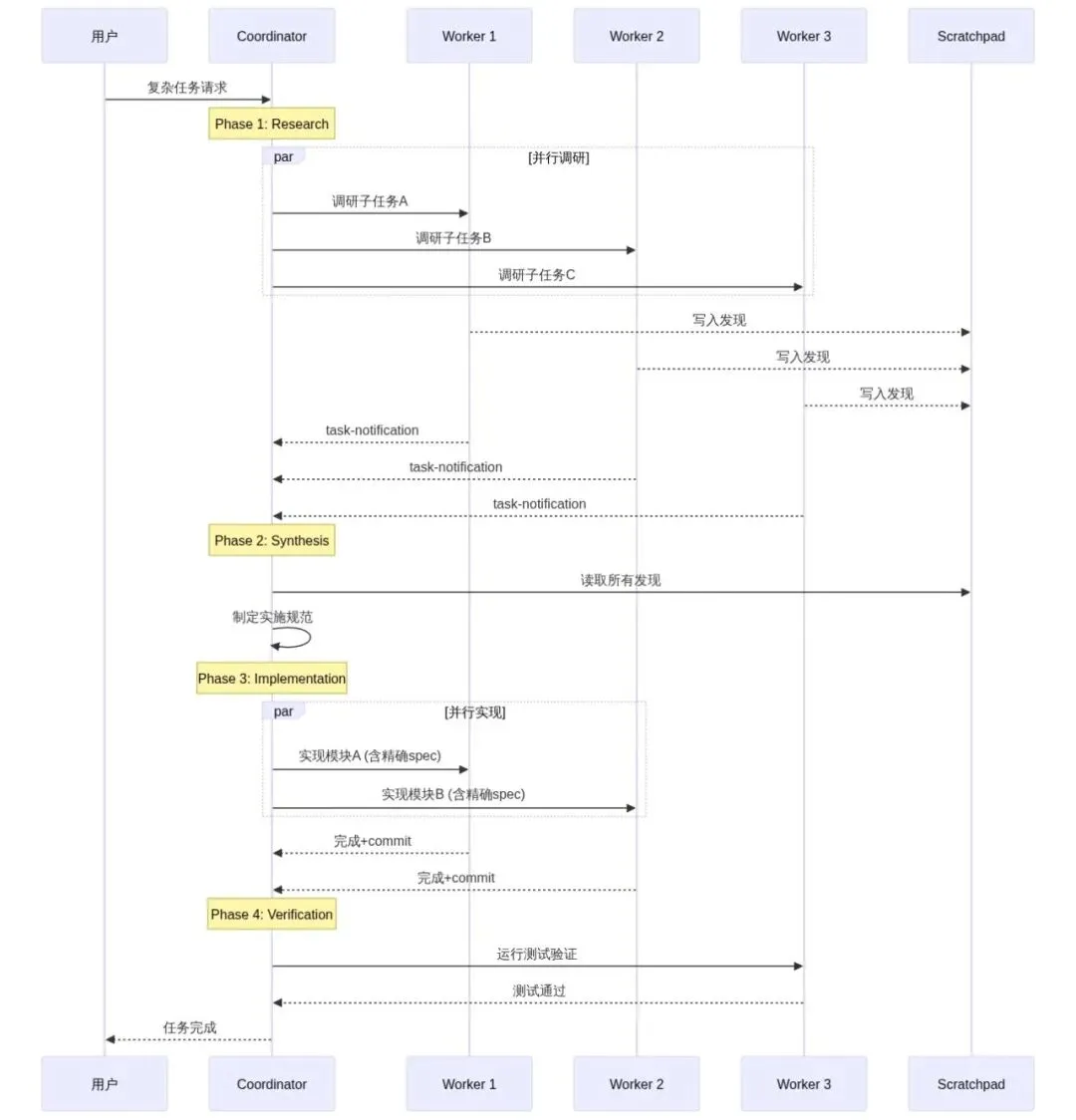 Synthesis阶段:coordinator读取所有worker的发现,理解全局问题,制定实施规范。这步只能coordinator自己做。