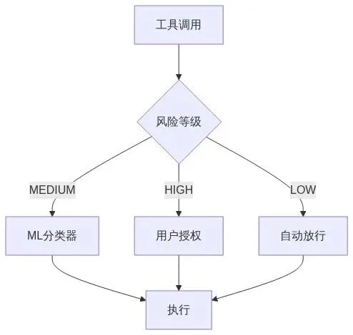 三级风险分类:每个工具调用被分为LOW、MEDIUM、HIGH三个风险等级。LOW直接放行,MEDIUM走ML分类器自动判断,HIGH必须用户手动授权。