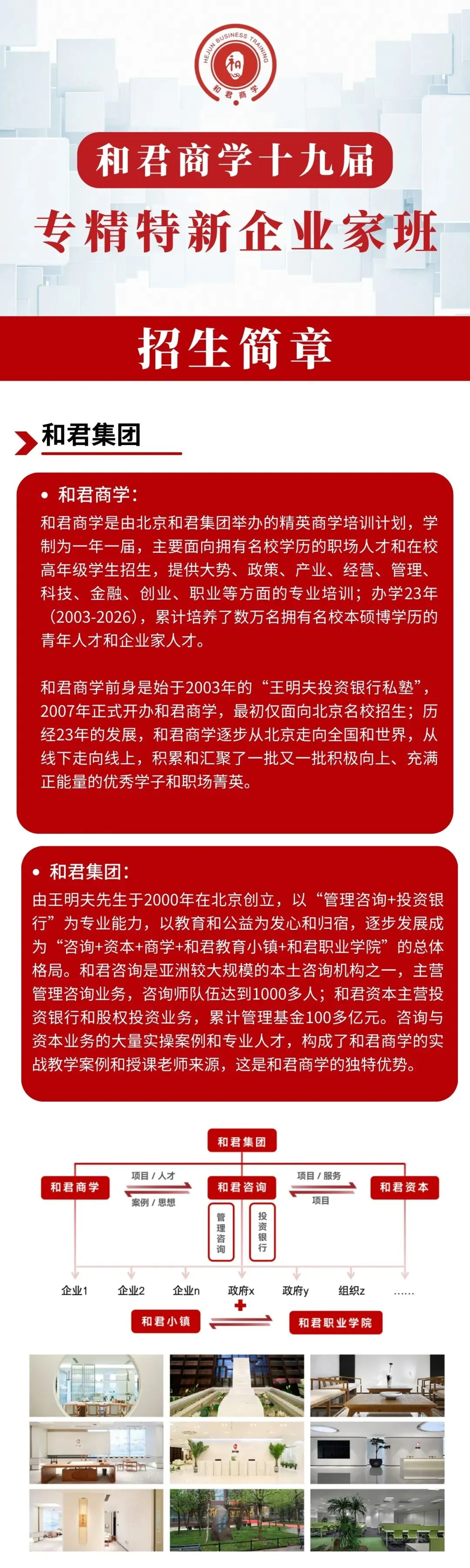 和君商学院是和君集团属下的北京和君商学在线科技股份有限公司兴办的一个商学培训计划,学制为一年一届,主要面向拥有名校学历的职场人才和在校高年级学生招生,旨在培养企业经营和管理、金融、投资、创业创新等领域的职业高手,帮助学员实现高薪就业、转行、换岗、晋升、高阶职业发展、创业、事业升级。办学历史23年(2003-2026),累计培训了两万多名拥有名校本硕博学历的青年人才和企业家人才。