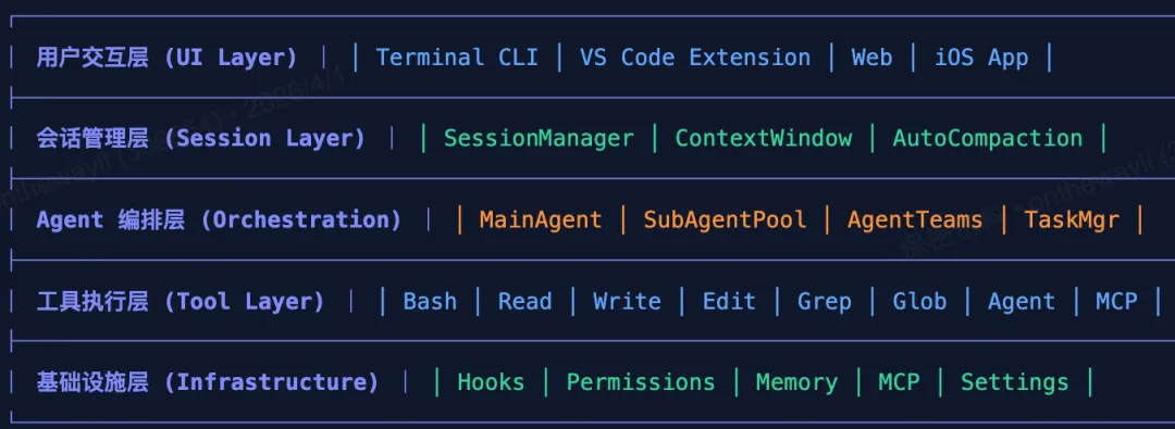 从源码结构分析,Claude Code 的架构可以抽象为五个层次,每层职责清晰, 通过标准接口进行通信: