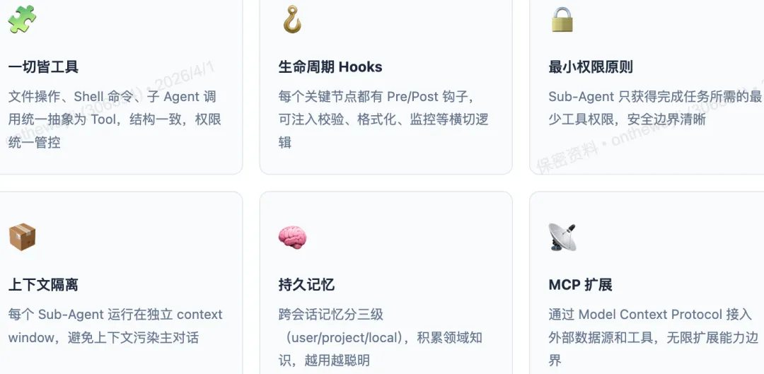 这次泄露让我们得以一窥工业级 Agent 系统的真实内部结构,包括:多 Agent 编排机制、工具调用架构、 Hooks 生命周期系统、权限管理模型、记忆持久化方案等。本文从工程学习角度出发, 梳理其中对 Agent 开发最具参考价值的设计思路。