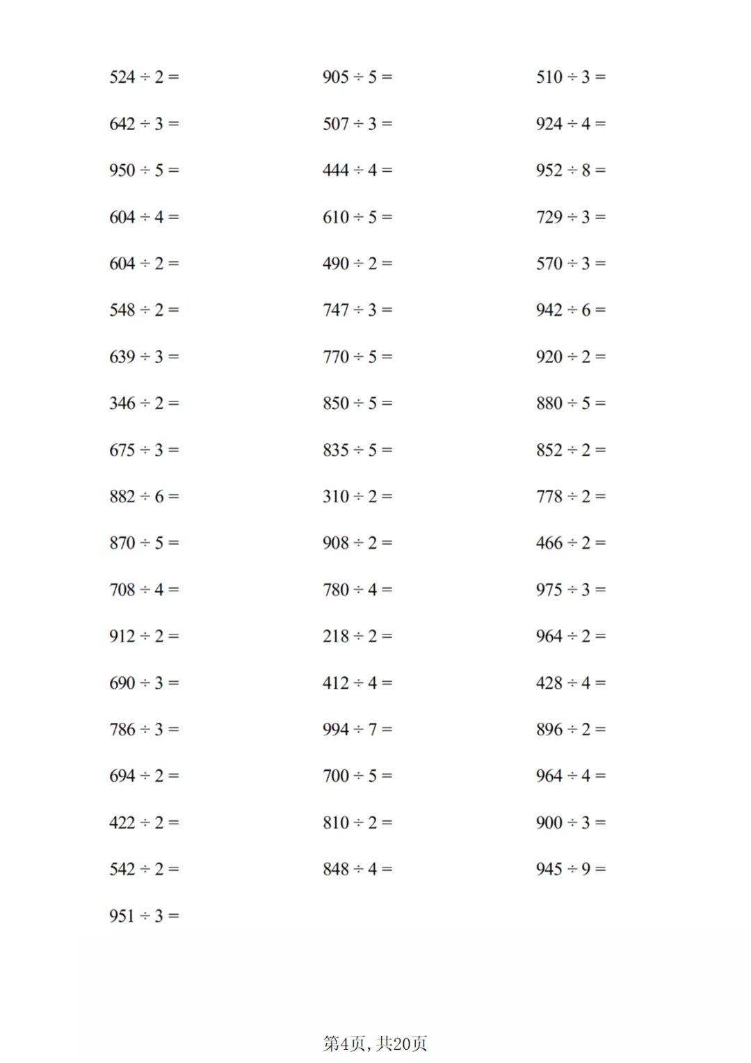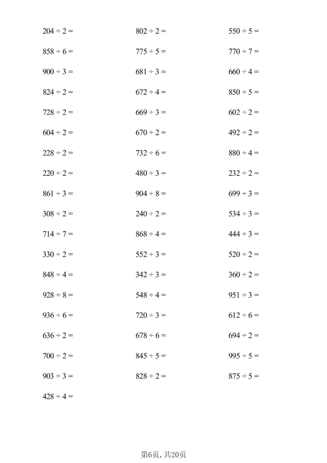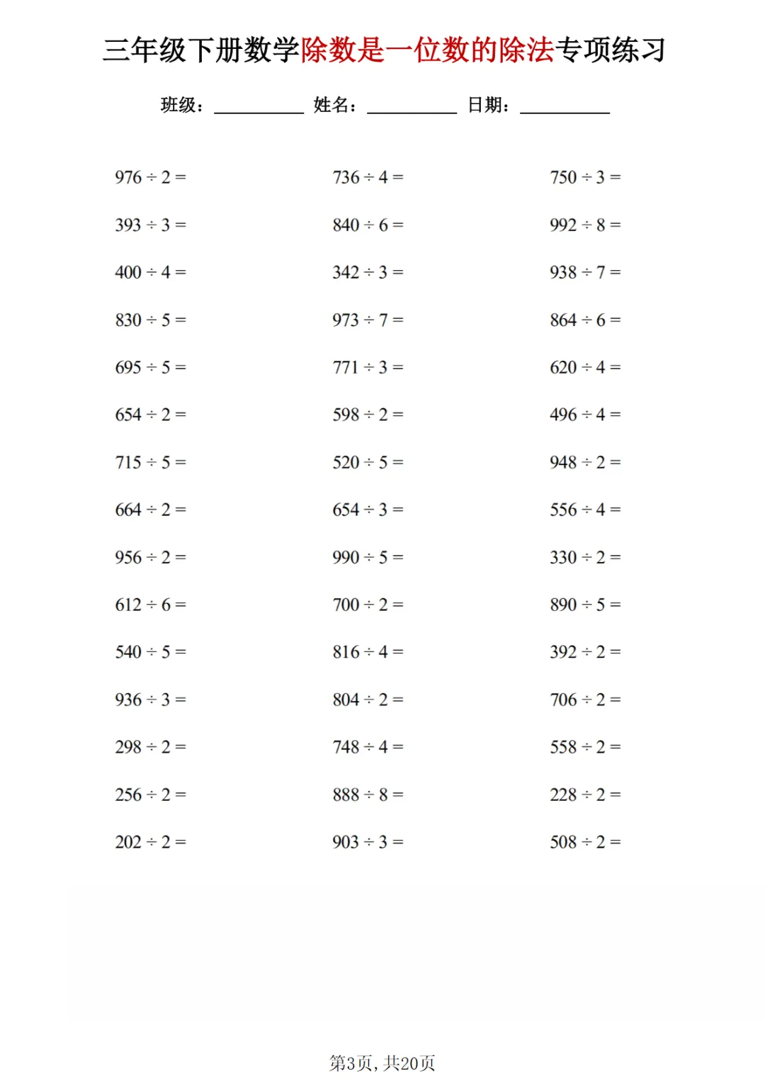 【免费下载】三年级(下)数学 除数是一位数的除法专项练习1PDF高清电子版,可打印,先保存后