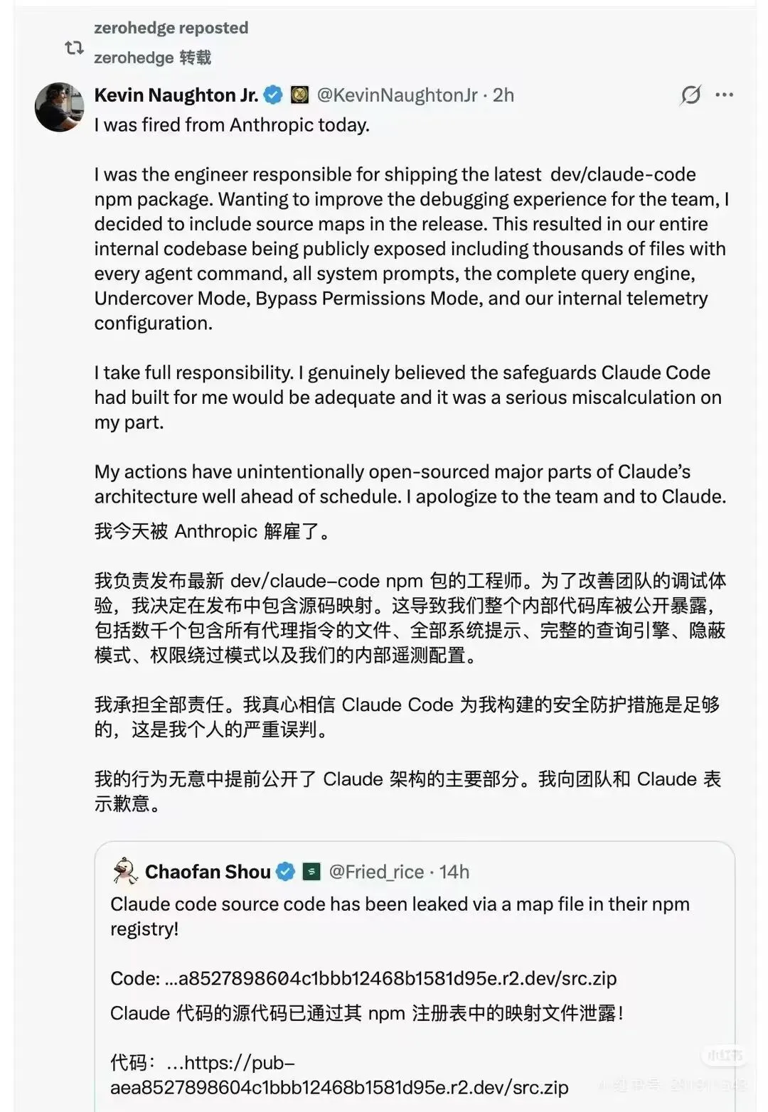 Claude Code是Anthropic官方的CLI编程助手,本次泄露的源码版本为:@anthropic-ai/claude-code v2.1.88,该编程助手基于TypeScript开发,使用React Ink进行终端UI渲染。整个程序打包为单个cli.js文件(13MB),源码包含1906个自有源文件和2850个第三方依赖文件。至于为什么会被泄露,答案见下图: