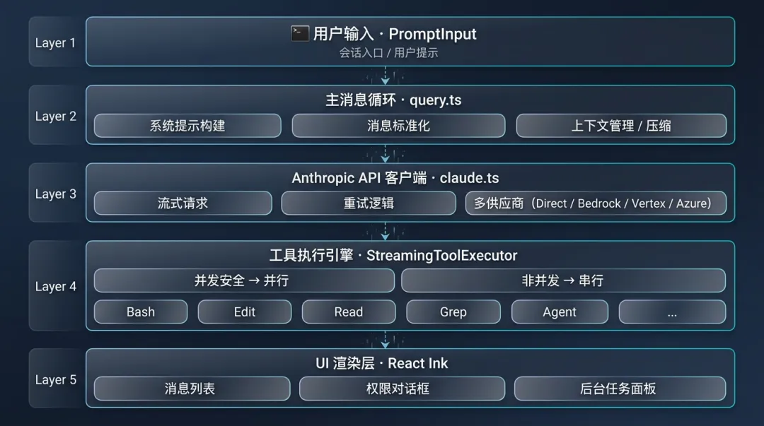 该架构采用自上而下、职责分层的设计: 最上层由PromptInput承接用户输入,作为会话入口;随后进入以 query.ts 为核心的主消息循环,在同一轮对话中完成系统提示拼装、多轮消息规范化以及上下文裁剪与压缩,把可发送给模型的状态收敛到可控规模。中间层由 claude.ts充当 Anthropic API 客户端,在流式传输、失败重试与回退以及Direct / Bedrock / Vertex / Azure 等多后端路由之间统一抽象,保证调用路径一致、可观测且可恢复。模型若产出工具调用,则由 StreamingToolExecutor作为工具执行编排层:依据各工具的并发安全性在并行(上限约束)与串行之间分流,驱动Bash、读写检索、子Agent等工具链落地,并把结果回注对话。最底层由基于React Ink 的UI渲染层负责消息流展示、敏感操作权限确认与后台任务面板,把异步、长耗时与需人工裁决的行为与主交互界面贯通,从而形成从「输入—推理—工具—反馈」到「终端呈现与治理」的闭环。