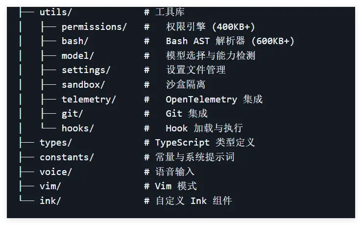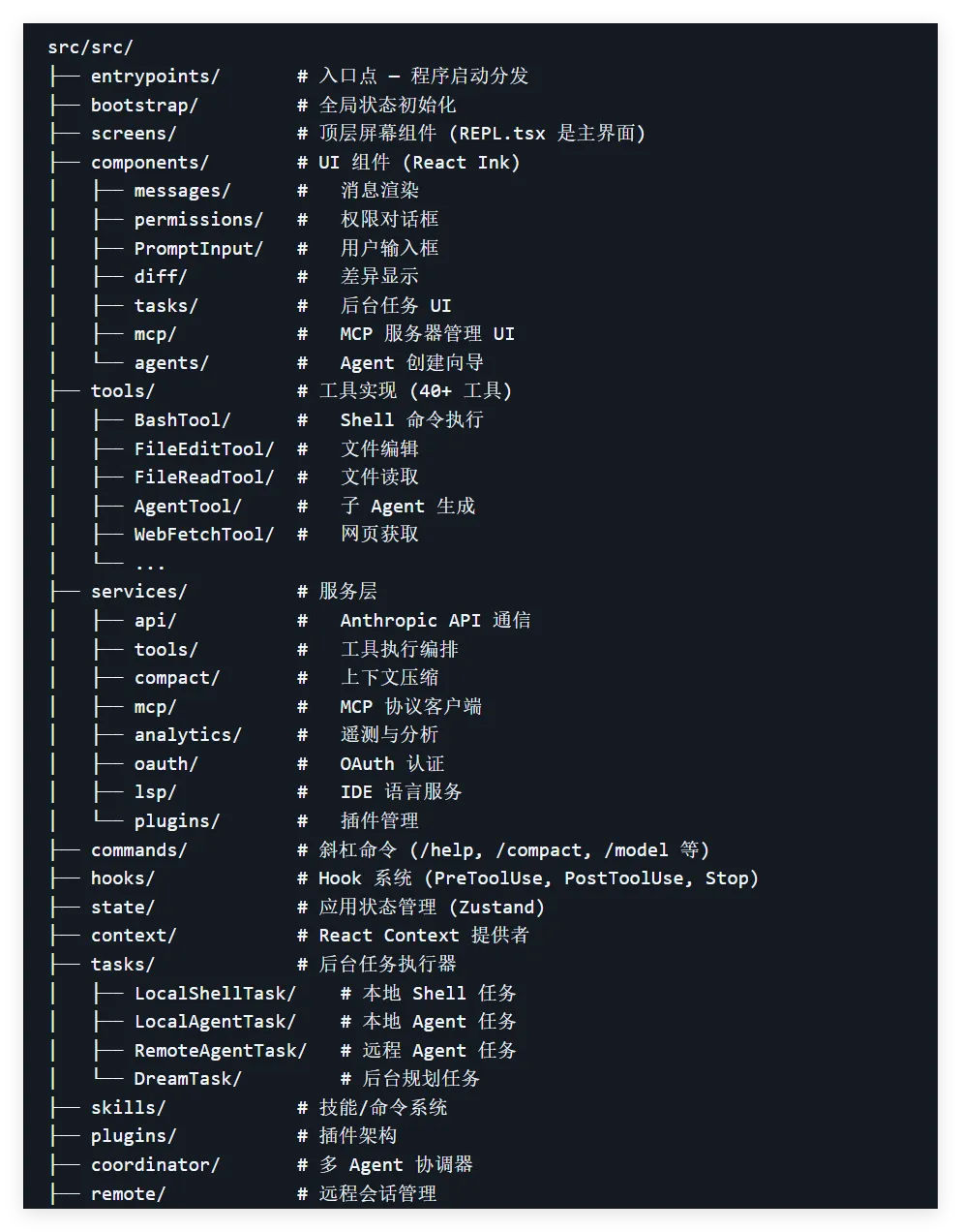 src/src/ 源码文件包含入口(entrypoints、bootstrap)、主界面(screens 里的 REPL.tsx)、各类 UI 组件(消息、权限、输入、差异对比、任务、MCP、创建代理等)、四十多种工具实现(如 Bash、文件编辑、网页抓取),到服务层(与 Anthropic 通信、工具编排、上下文压缩、MCP 客户端、遥测、OAuth)、斜杠命令、生命周期 Hook、Zustand/React Context 状态、后台任务执行器(本地/远程 Shell 与代理任务),以及技能、插件、多代理协调与远程会话等模块,其中 utils 下包含了体量很大的权限引擎与 Bash AST 解析、模型与配置、沙盒、遥测、Git 与 Hook 加载等,其整理结构关系如下图 :