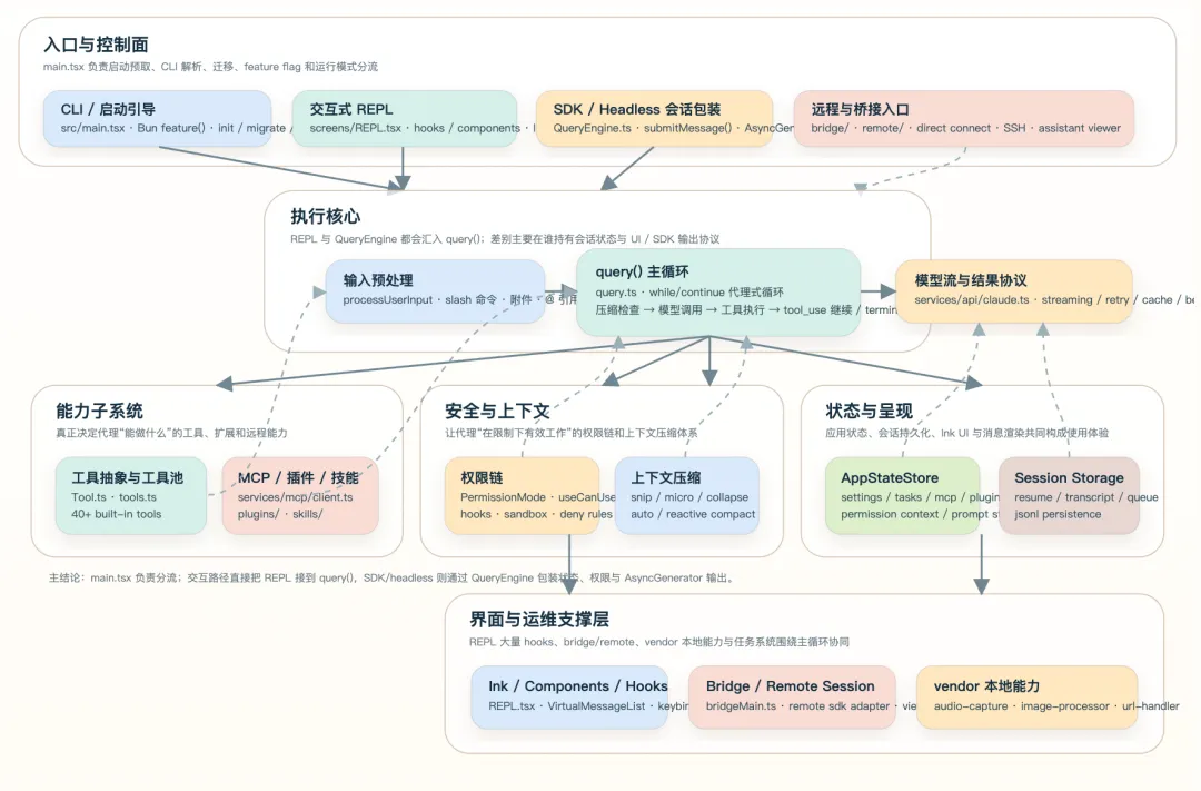 Claude Code 的组织架构图,就像一家公司的部门划分。不管你是在终端里打字、用代码调接口、还是从网页远程控制,所有请求最终都会送到同一个总指挥。