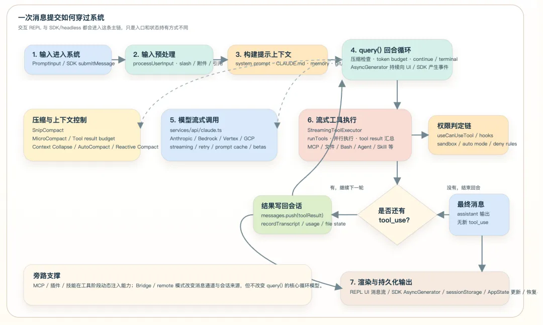 描述的是你发一条消息后,它在系统里走了怎样的旅程。比如你说”帮我修这个 bug”,Claude Code 不是想一下就给你答案。它做了这么一件事循环:想 → 动手 → 看结果 → 还没搞定?→ 再想 → 再动手 → 搞定了 → 告诉你。这个”想→做→看→再来”的循环可以转很多圈,直到 Claude 自己觉得做完了才停下来。