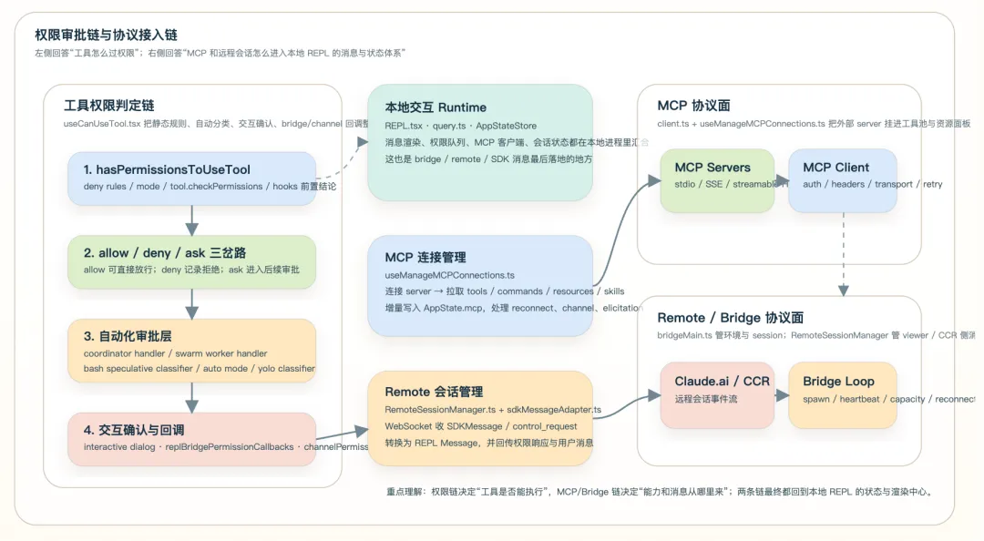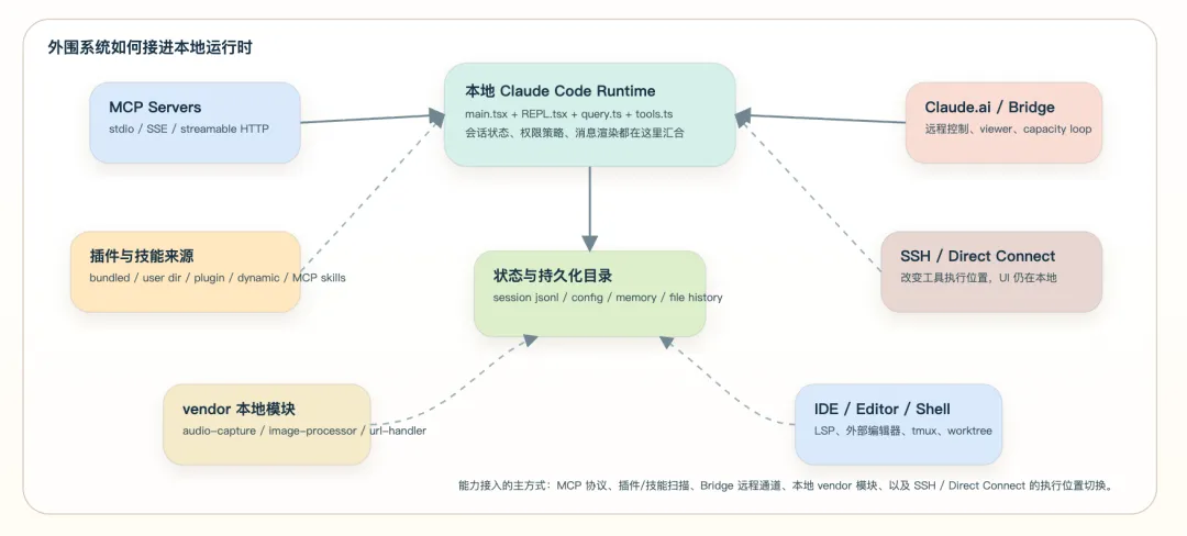 这一层解释外面的各种技能和工具是怎么插到 Claude Code 身上的。Claude Code 本身会写代码、跑命令,但它还能学新技能。通过插件连接数据库、通过远程桥接让网页版控制你本地的 Claude、通过 SSH 在另一台电脑上执行命令。这张图就是在说:所有这些外挂能力,最终都被翻译成 Claude Code 看得懂的统一格式。