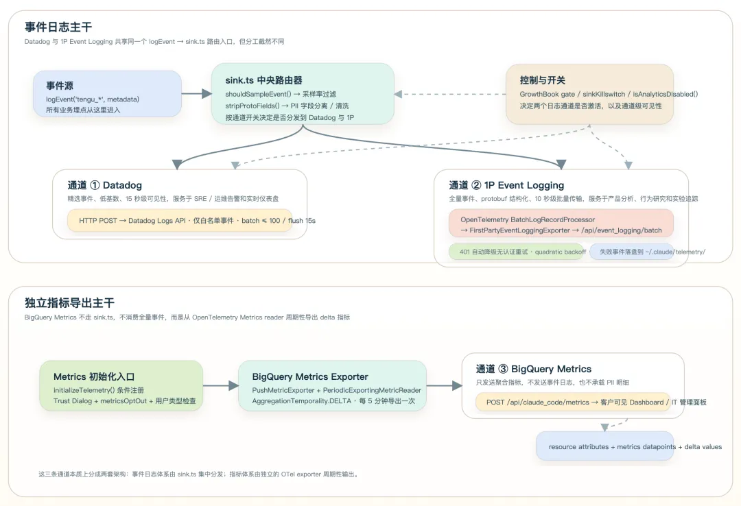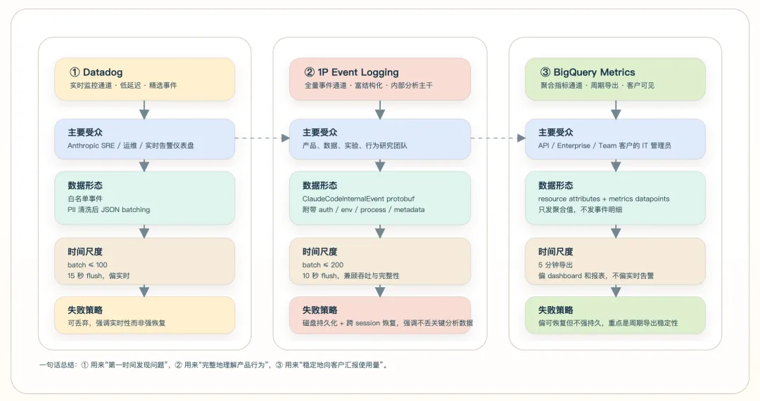 Claude Code 在你用它的时候,悄悄把三种不同的使用日记发到三个不同的地方。用来第一时间发现问题,事后完整回放发生了什么,以及稳定地告诉客户你用了多少额度。