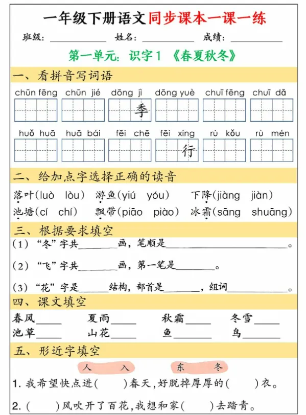 这份练习册是同步课本“一课一练”设计,覆盖一年级下册语文核心知识点,题型包含: