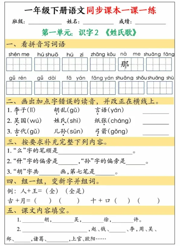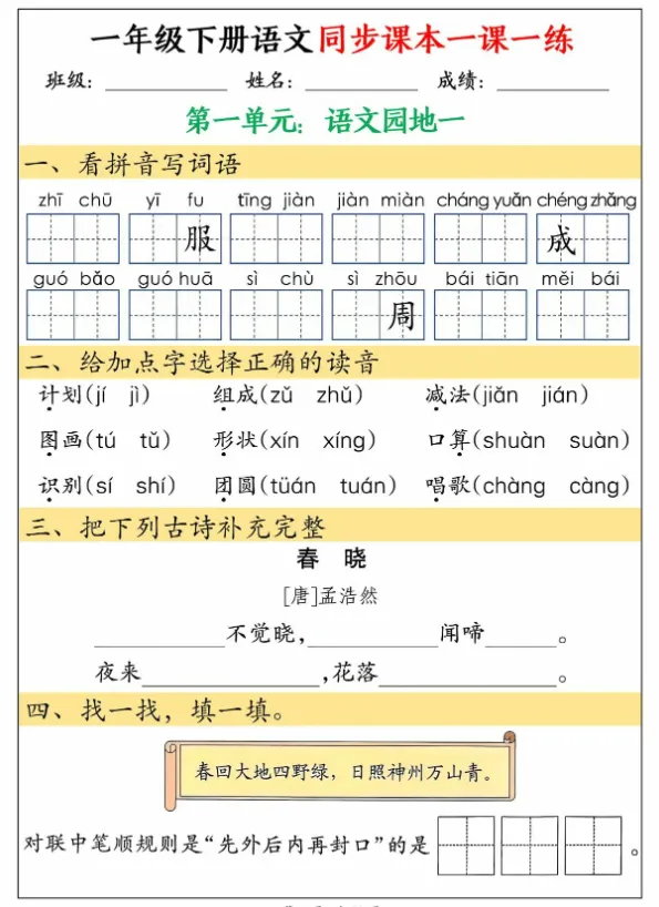 即可免费获取《一年级下册语文同步课本一课一练》完整电子版(30页PDF格式)!您可以直接下载,打印出来让孩子随时练习~