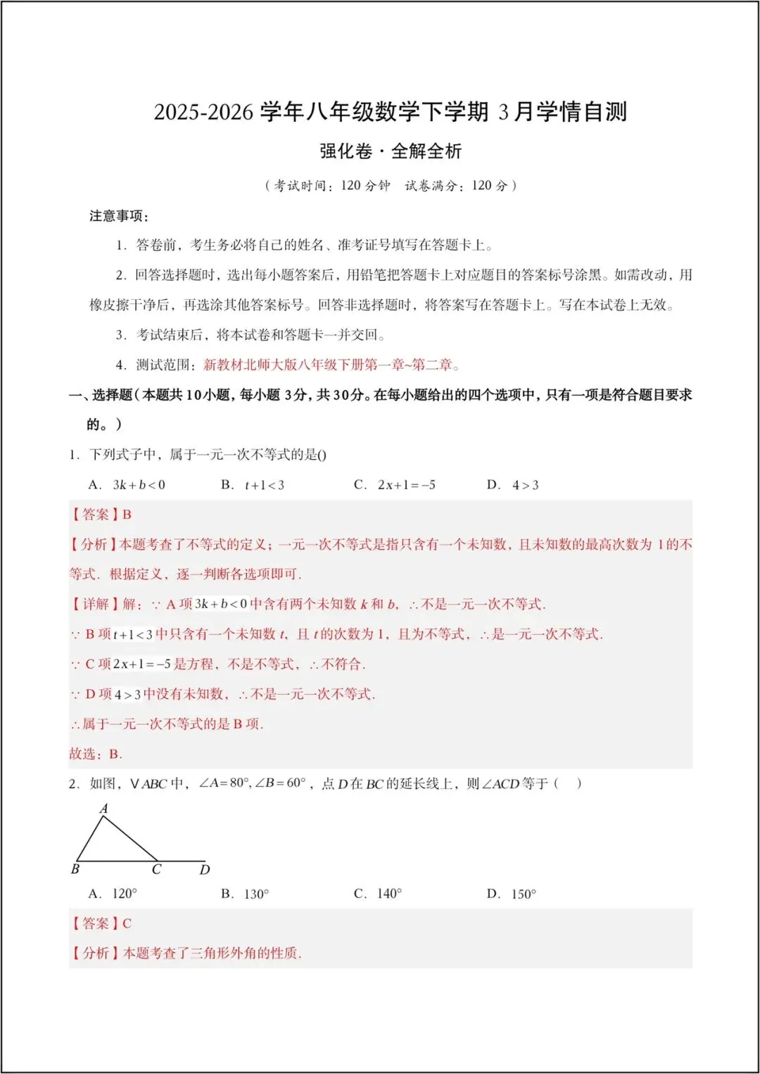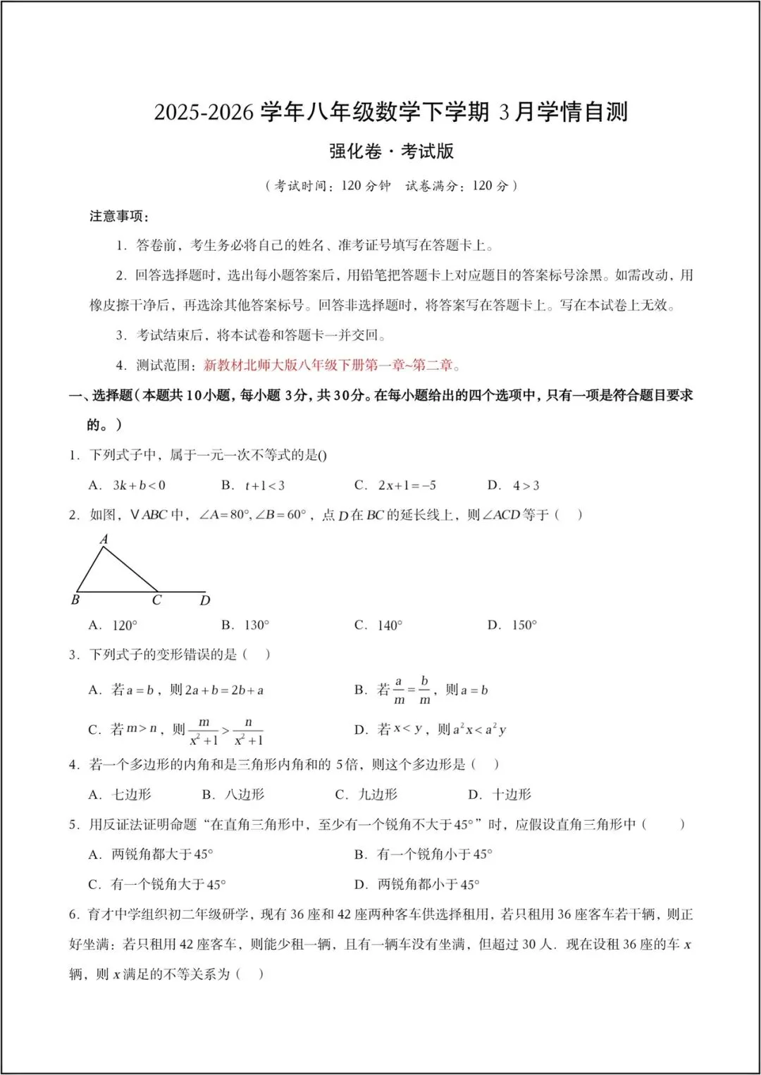 2026新(北师大版)八年级下册(数学)第一次月考试卷(含答案),电子版可打印!