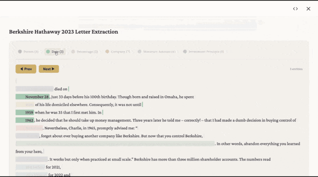 下面是提取后生成的页面。不同颜色代表不同类型:人物、日期、公司、金额。
