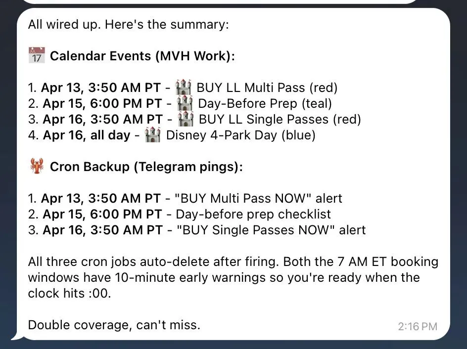 OpenClaw 读取计划,在日历上设了事件,还设了 cron job 备份,在 Telegram 上提醒他。每个关键预订窗口都有双重覆盖。