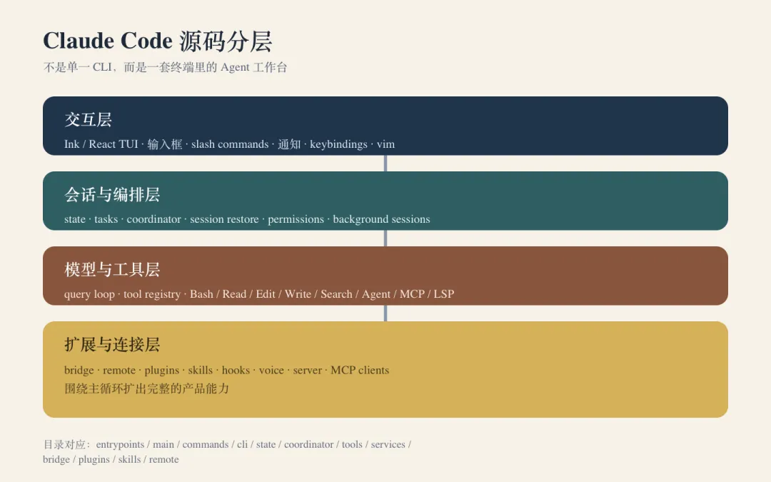 用一句话收束:Claude Code 在源码层面呈现的是「终端内的 Agent 运行时 + 工作流编排」,CLI 是外壳,编排与扩展才是骨架。