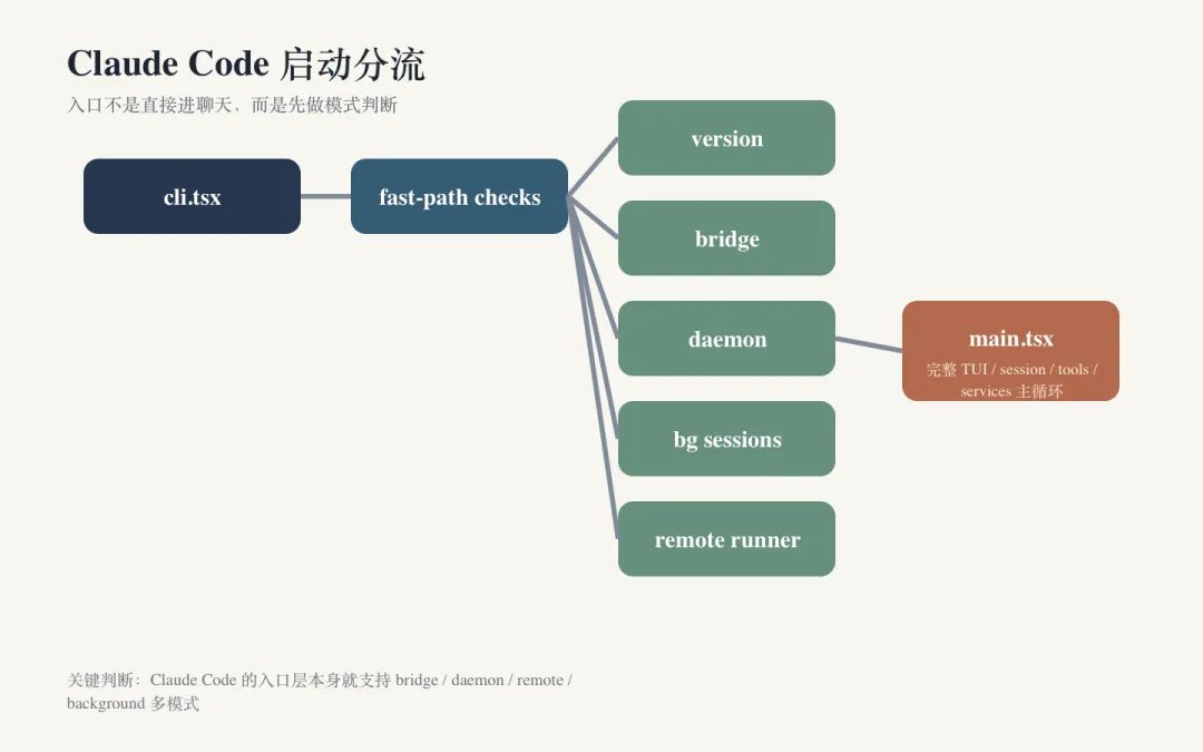 设计要点:启动阶段按模式分流,再进入各自主循环;源码中出现的模式包括但不限于 bridge、remote-control、daemon、background sessions、template jobs、environment runner、self-hosted runner 等,对应「本地终端 + 远程/后台/托管」等多运行形态,而非单一 REPL。