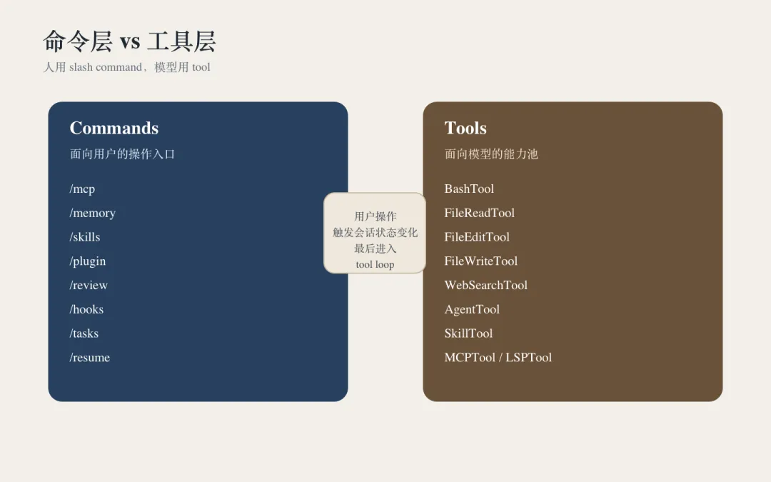 要点:命令 ≠ tool。命令服务交互与配置;tool 服务模型与环境的自动化读写与执行。二者在会话主流程中汇合,但边界清晰。