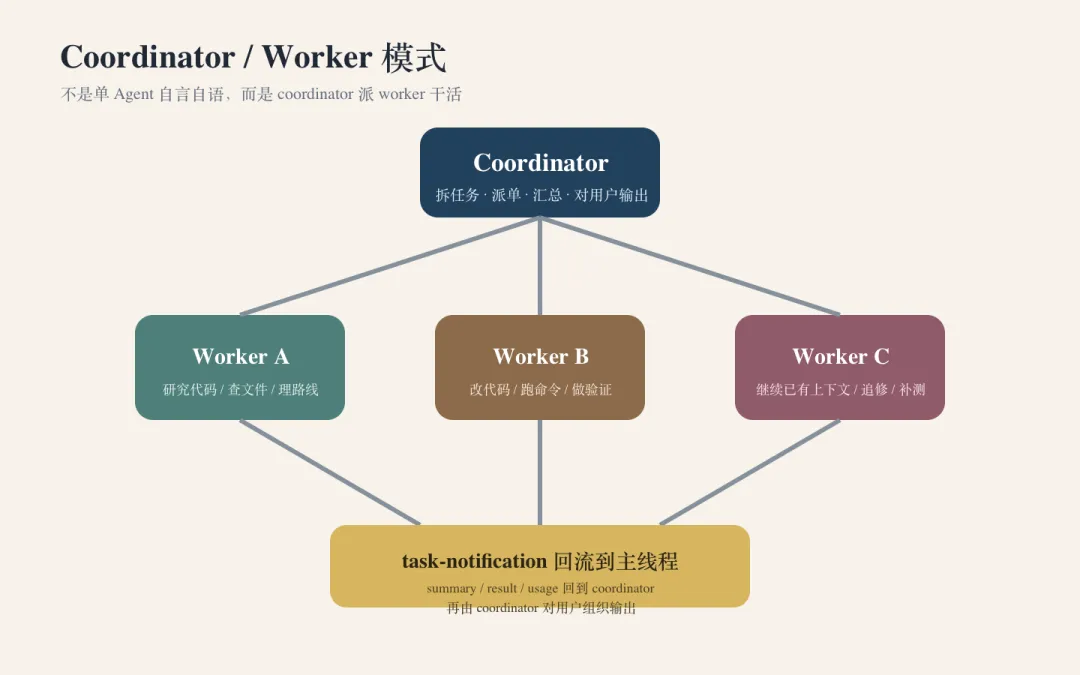 从模块命名与类型可归纳出一套 coordinator / worker 结构:协调侧负责任务拆分与结果汇总,worker 侧执行子任务;内部存在任务/团队相关的消息与生命周期类型(如 TaskCreate、TaskUpdate、SendMessage、TeamCreate、TeamDelete、TaskStop 等),属于任务编排向设计,而非单 Agent 线性对话。